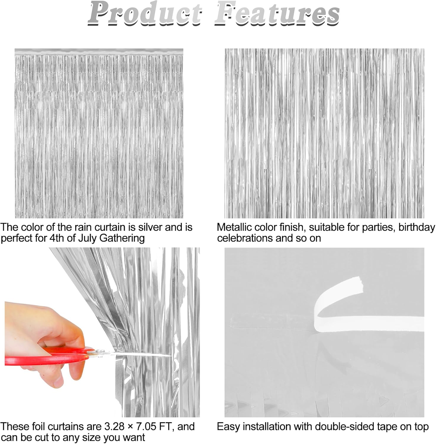 - Easy to Install: Each silver tinsel backdrop comes with an adhesive strip at the top. Simply peel off the backing and stick the party streamer to any smooth surface for a quick and hassle-free setup.