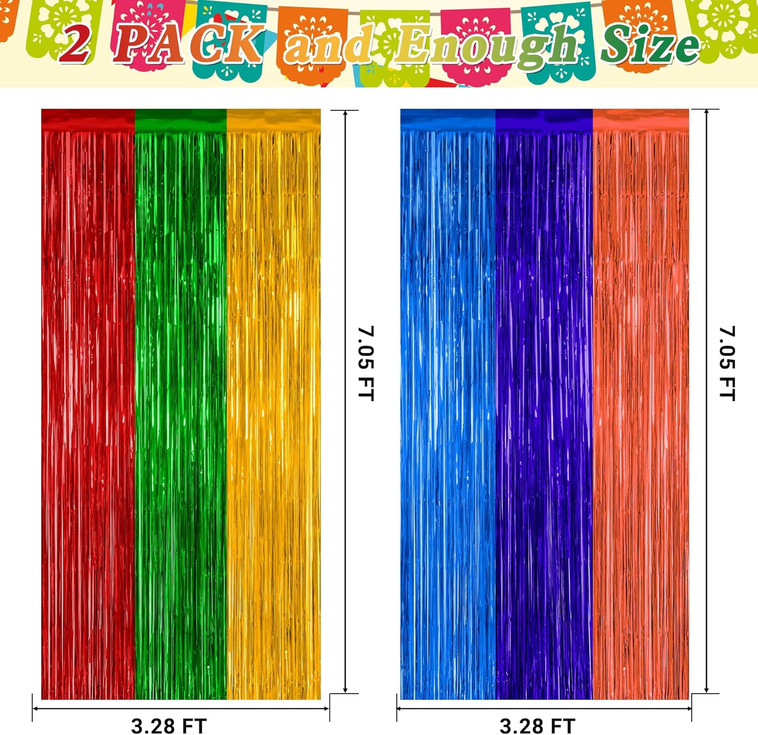 - Package Includes: This set includes 2 pcs rainbow foil curtains in Mexican colors, each measuring 3.28 ft x 7.05 ft, feel free to cut them to your desired length.