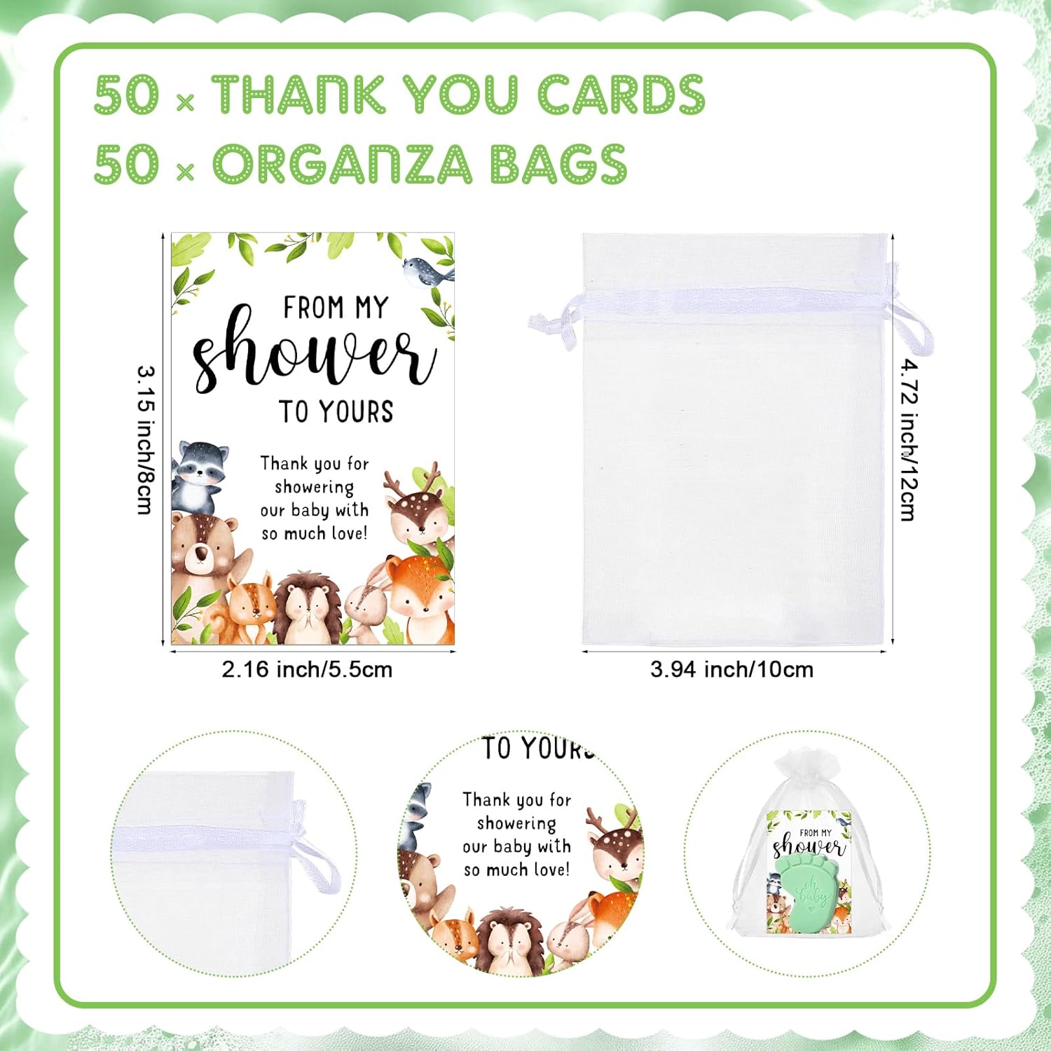- Exquisite Features: our baby shower soap favors are carefully combined; The thank you cards are made from 250g coated paper, resistant to bending and providing clear printing; Each organza bag is woven from organza yarn with a drawstring for easy packaging of soaps and thank you cards, providing a beautifully packed, ready to gift package