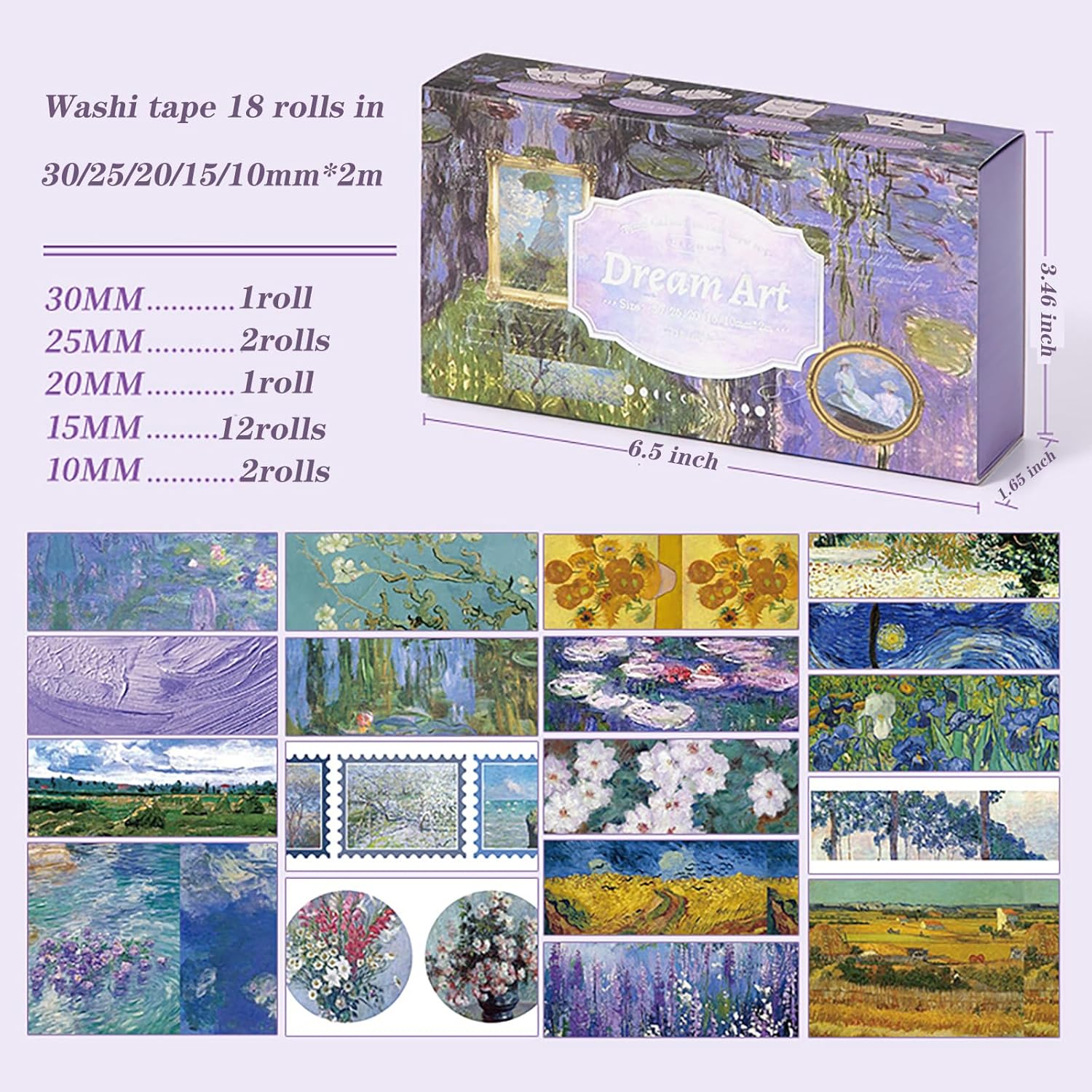 - Van Gogh's Art washi tape comes in a box with 18 rolls of high-quality washi tape in five sizes, including wide and thin washi tape. Each roll is 1.18 inches (30 mm) x 1 tape; 0.98 inches (25 mm) x 2 tapes; 0.78 inches (20 mm) x 1 tape; 0.59 inches (15 mm) x 12 tapes; 0.39 inches (10 mm) x 2 tape.