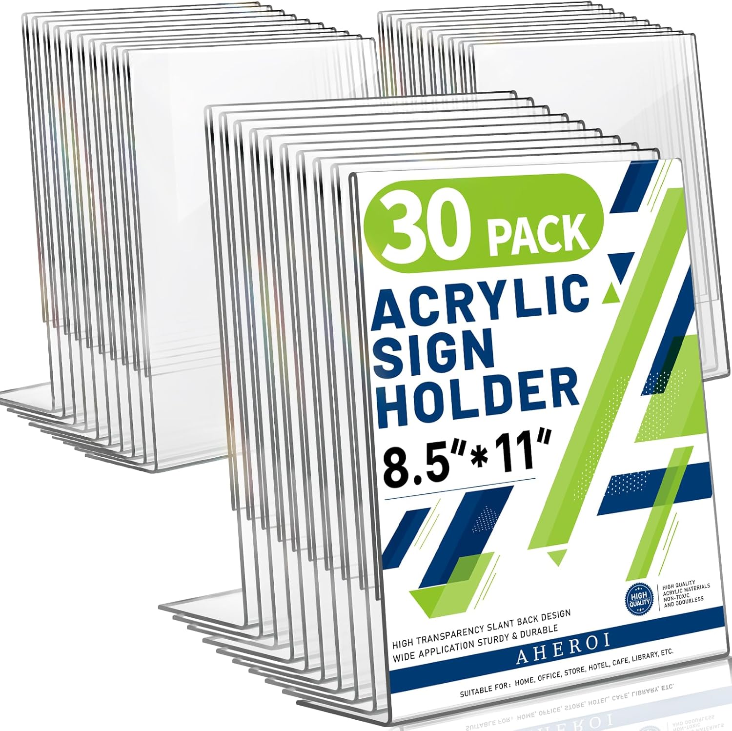 Aheroi Acrylic Sign Holder 8.5 x 11, 30Pcs Plastic Sign Holder 8.5 x 11 Standing, Clear Paper Holders Acrylic Paper Document Holders, Plastic Stands Flyer Display,Office School Table Supplies