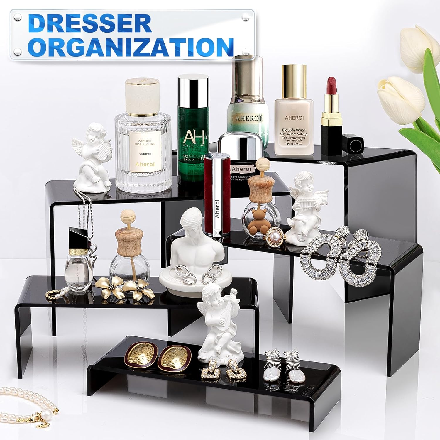 - Reusable & Cleanable:These display stand are also very easy to use, no assembly required no splicing, just put them in the right place for the items you need to display or organize! These acrylic risers display stands are washable and reusable. Simply wipe perfume stand with a damp cloth with warm water and the dust on the tiered shelf stand will disappear, very convenient. It won't hurt to use it again afterwards