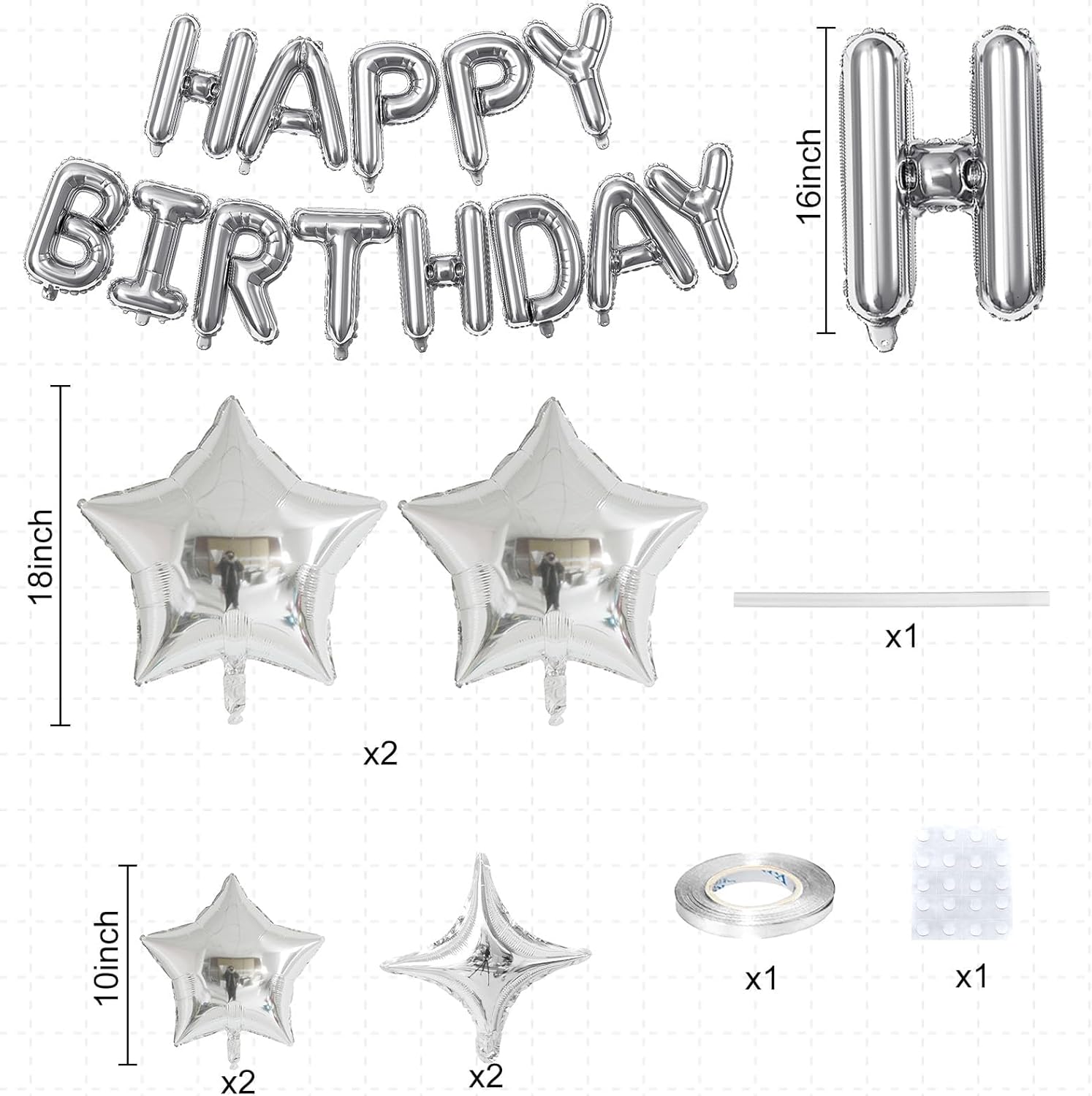 - VALUABLE PARTY DECORATION SET – Create an unforgettable birthday celebration with our Happy Birthday Balloons Banner set! Includes a 16-inch silver Mylar Foil Letter Balloons set, 4 silver star balloons, plus essential accessories like a ribbon, glue dots, and a straw for easy setup. Everything you need for a stylish and hassle-free party!