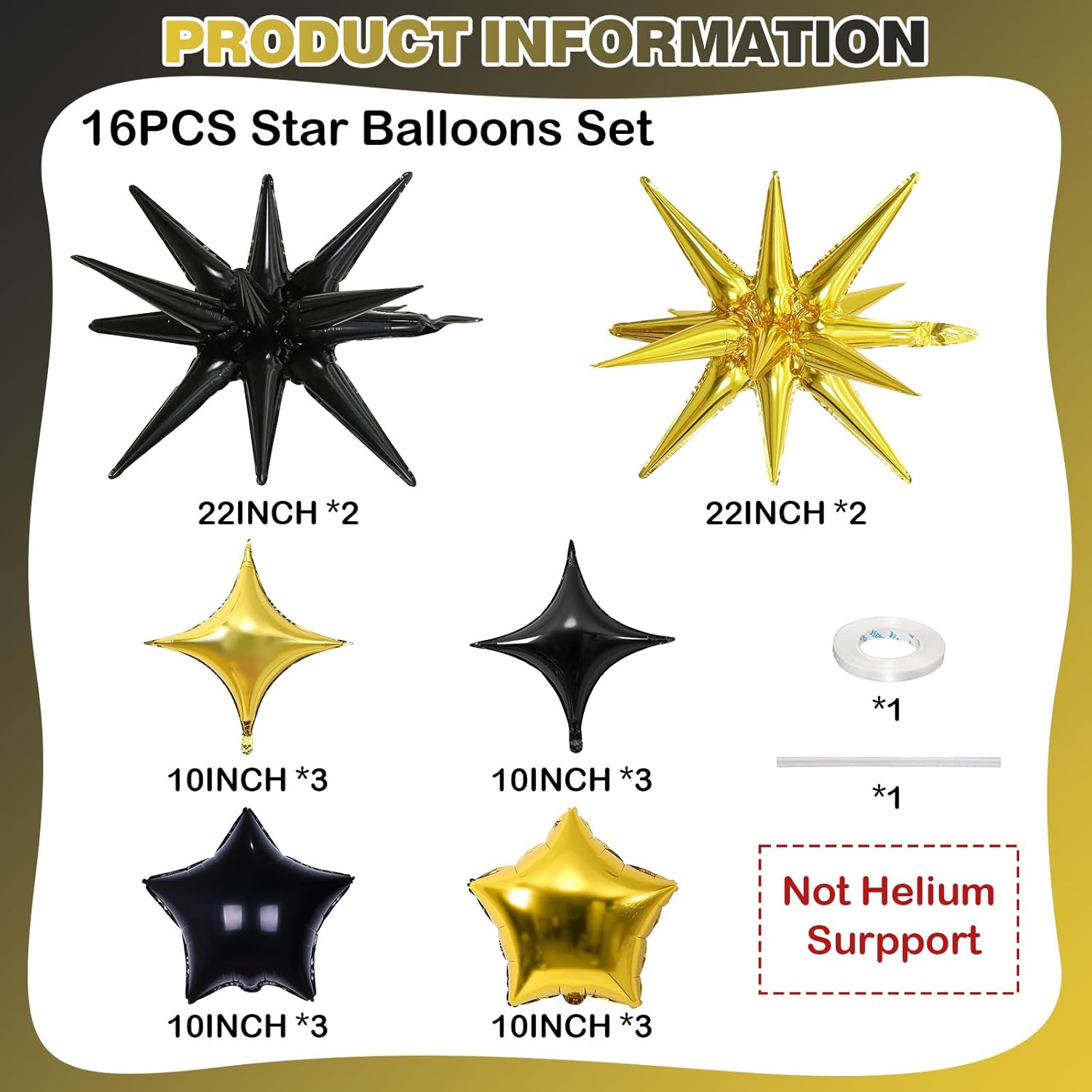 - Black Gold Balloons Set: Package includes: black, gold two-color aluminum foil star balloons (explosion stars Γ 4, four-pointed stars Γ 6, five-pointed stars Γ 6) , a straw and ribbon