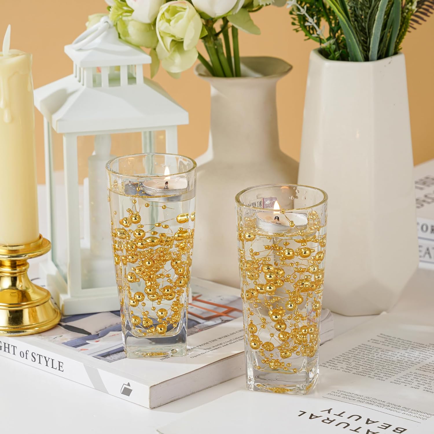 - Length: 13 feet (4 meters) floating candle centerpieces of continuous pearls on a spool for easy cutting and styling