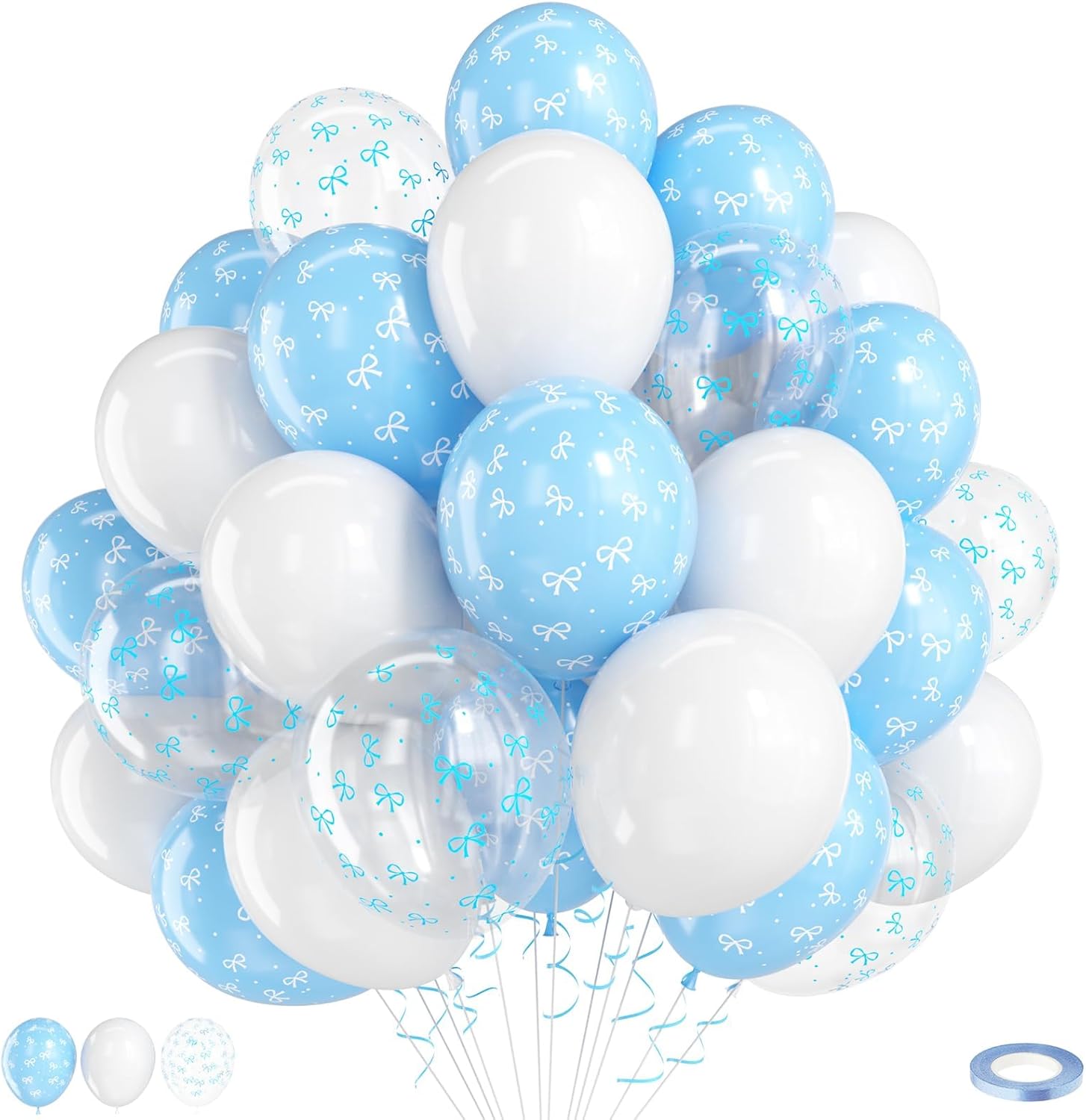 - 12 Inch Blue Bow Balloon Set: 10 x dusty blue bow print balloons, 10 x transparent bow print balloons, 10 x white balloons, and 1 x light blue ribbon. The elegant combination of blue and white is ideal for adding a touch of sophistication to any celebration.