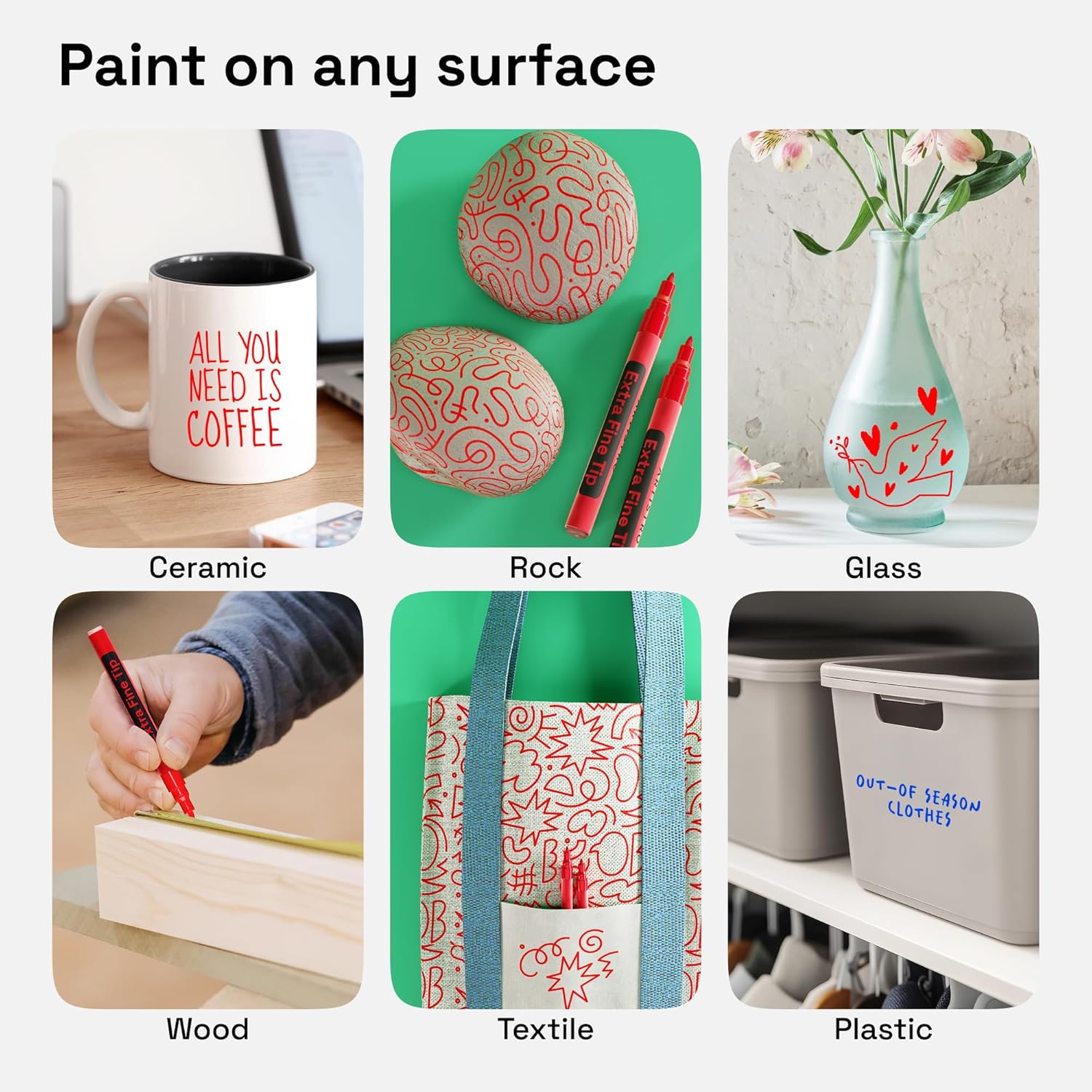 - Works on Multiple Surfaces: Use red oil paint pens on glass, plastic, metal, fabric, leather, wood, vinyl, stone, ceramic, or epoxy resin. Each red marker is water-resistant and long-lasting, making them ideal for both indoor and outdoor projects.