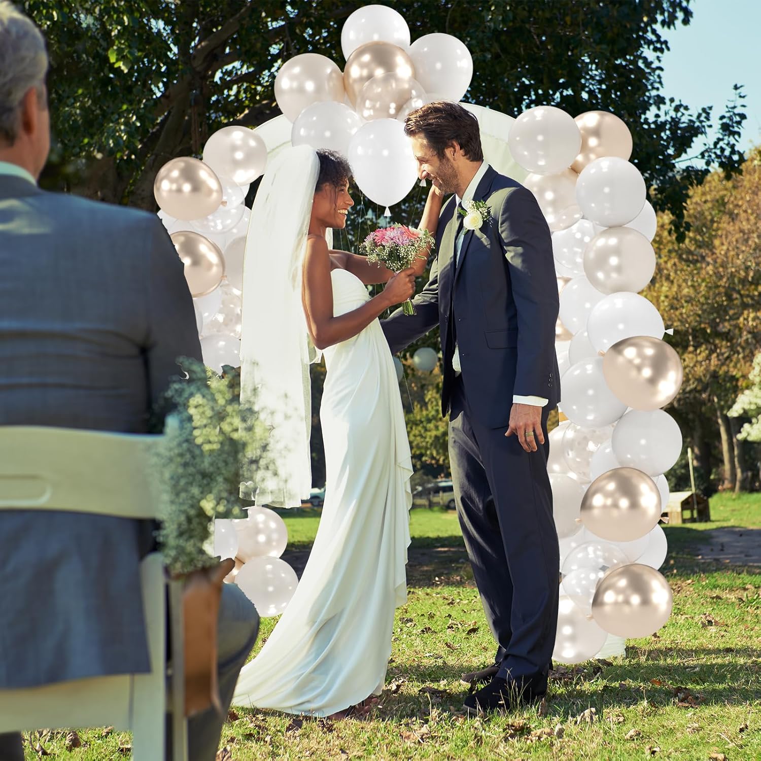 100pcs White and Gold Balloons - 12inch Sand White Metallic Champagne Gold Nude Pearl White & Clear Balloon for Baby showers, Wedding, Bachelorette, Graduation (with 66ft Ribbons)