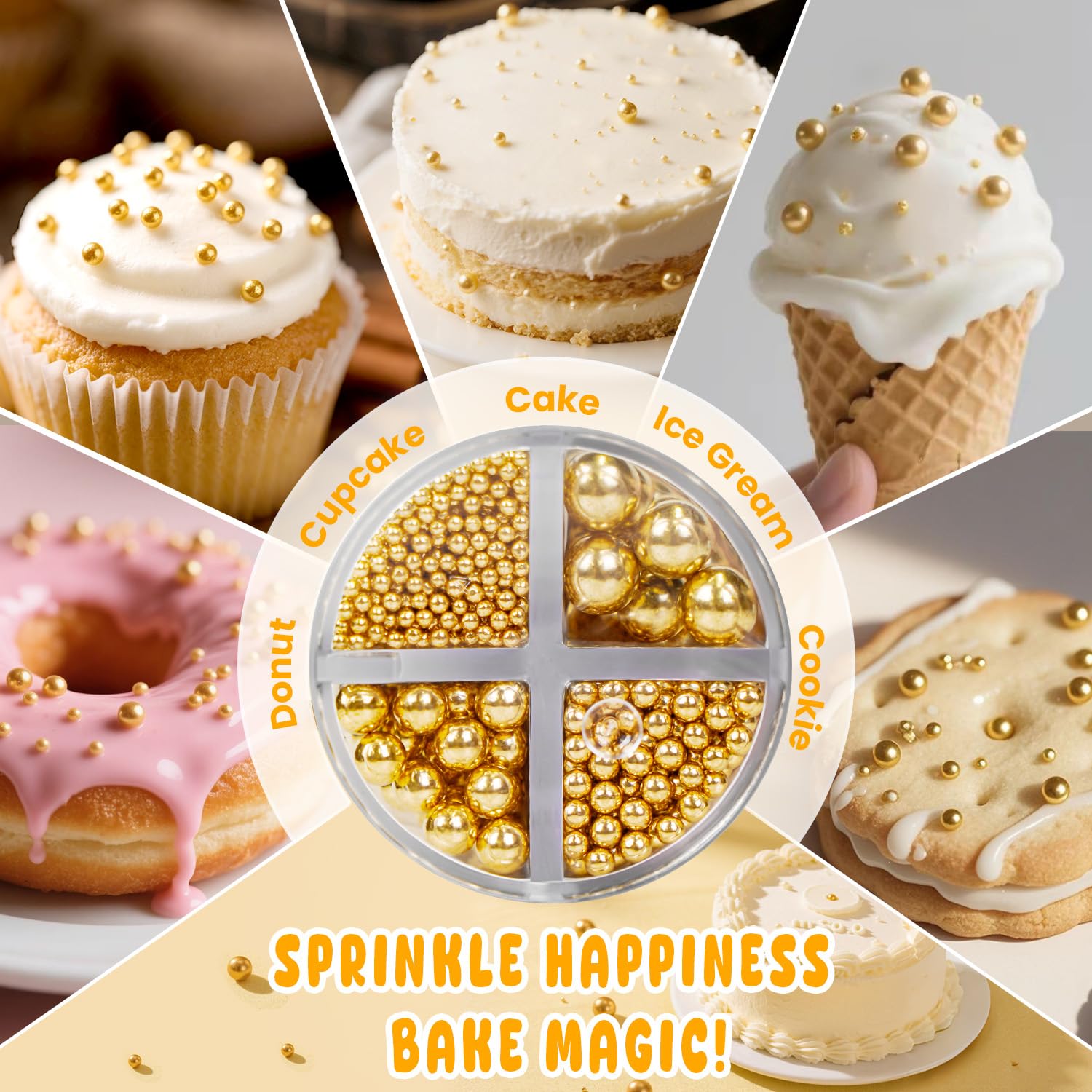- The Gold Pearl Sprinkles can be used to decorate cupcakes, ice cream, cakes, cookies and chocolates. Gold Pearl Candies are an excellent choice for baking desserts. Gold pearl sprinkles can make your baking more elaborate. They are simple to use, just sprinkle them over your baking as they transform into works of art.