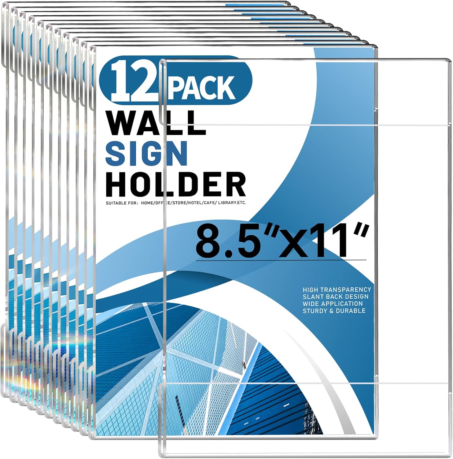 Aheroi Acrylic Sign Holder 8.5 x 11, 12 Pcs Clear Document Frame with Adhesive Tape, No Drilling Plastic Wall Mount 8.5 x 11 Acrylic Hanging Frame Plastic Sign Holder for Office Business Menu Store