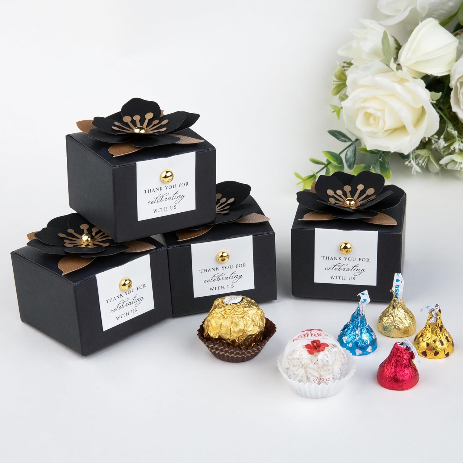 FEIYI 20 PCS Candy Boxes, 3 In 1 Black Favor Boxes with Floral Decor, White Thank You Tags Gift wrapping for Wedding Birthday Baby Shower Decorations Party -2.55x2.55x1.77''