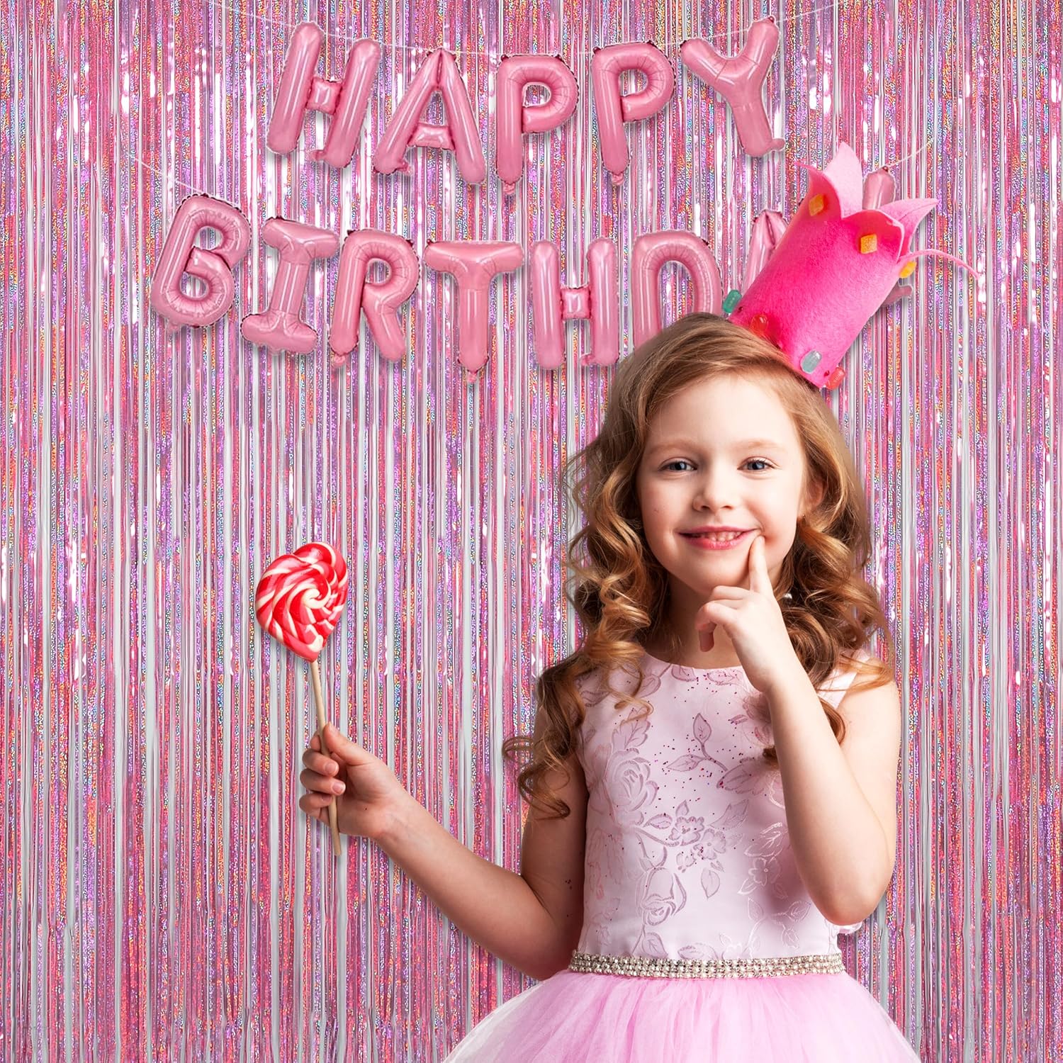 - Double-Pack Glamour: Two full-coverage pink foil fringe curtains create instant magic for doors, walls, or photo zones. The laser-cut tinsel reflects light beautifully, making it a must-have for unicorn-themed birthdays, mermaid baby showers, and dazzling bachelorette parties