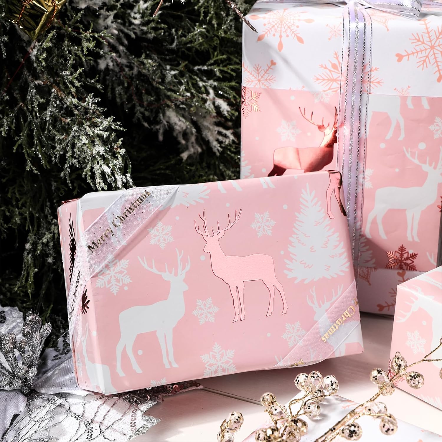 LeZakaa Christmas Pink Wrapping Paper Jumbo Roll, Reindeer & Snowflake, Metallic Foil, Rose Gold Foil Reversible Design for Festive Winter Holiday, Family Gathering, 30 inches x 32.8 Feet