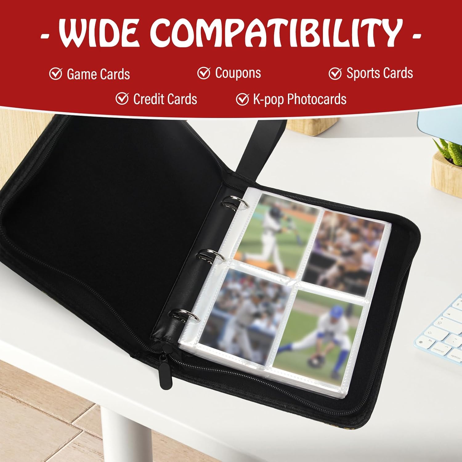 - Unique Design:Open the creative card holder along the zipper direction, select the card you want to collect, and gently insert it into the card slot. The flexible 3-ring design allows you easily to insert and remove the pages,the clear and transparent card slot allows you to see every detail of the cards without taking out