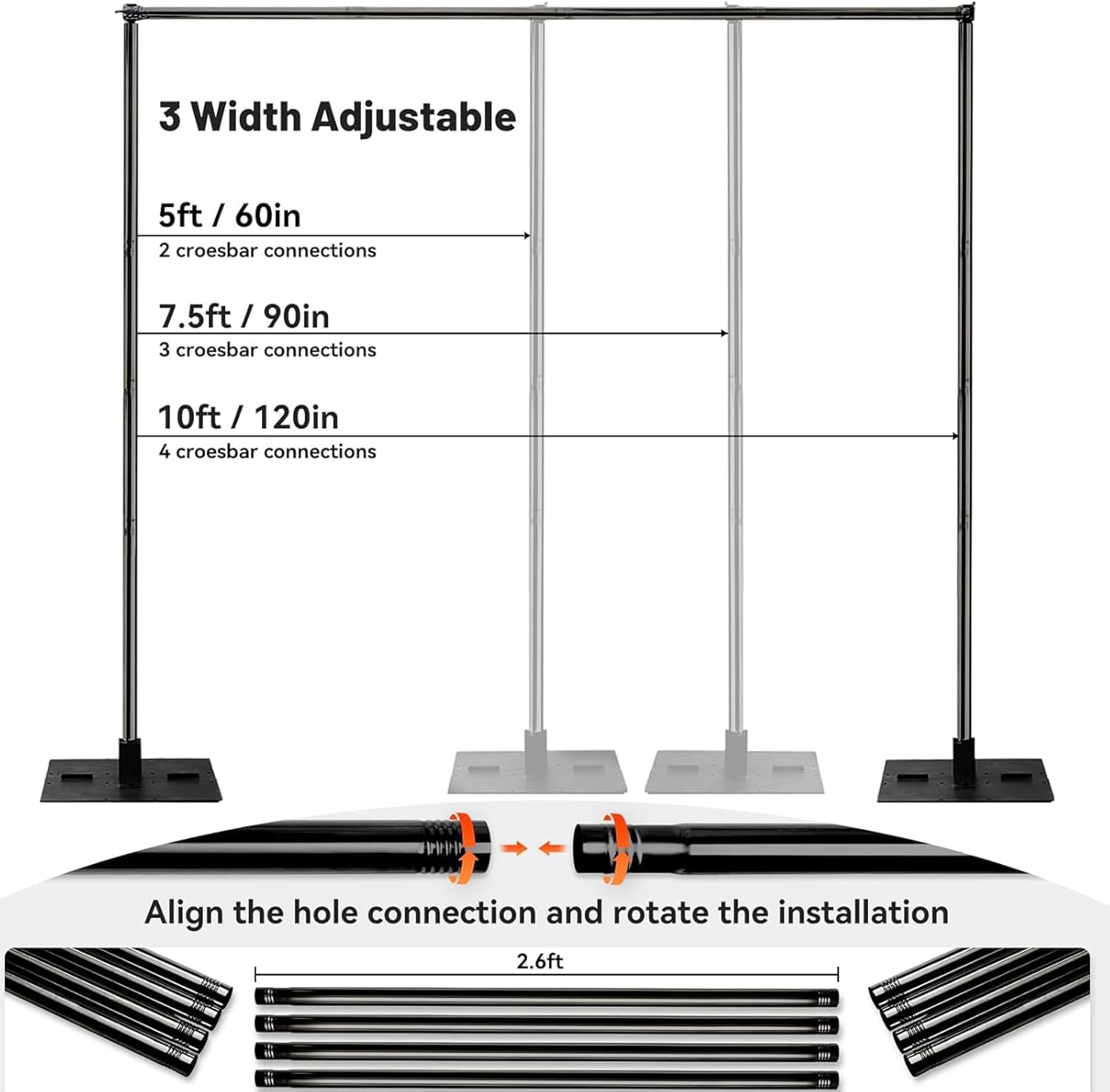 - Adjustable Height & Width: Both the height and width of the pipe and drape stand are adjustable to meet your needs, with options available in 5ft, 7.5ft, and 10ft, providing versatility for different setups.