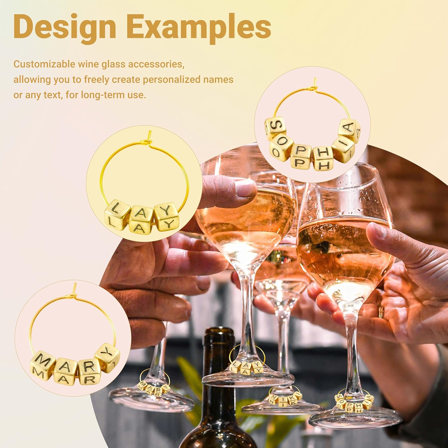 - DIY Wine Charms Kit: 300 distressed gold square letter beads + 50 KC gold-plated hoops (1-inch diameter) create name tags or phrases like "Cheers" for drinkware identification