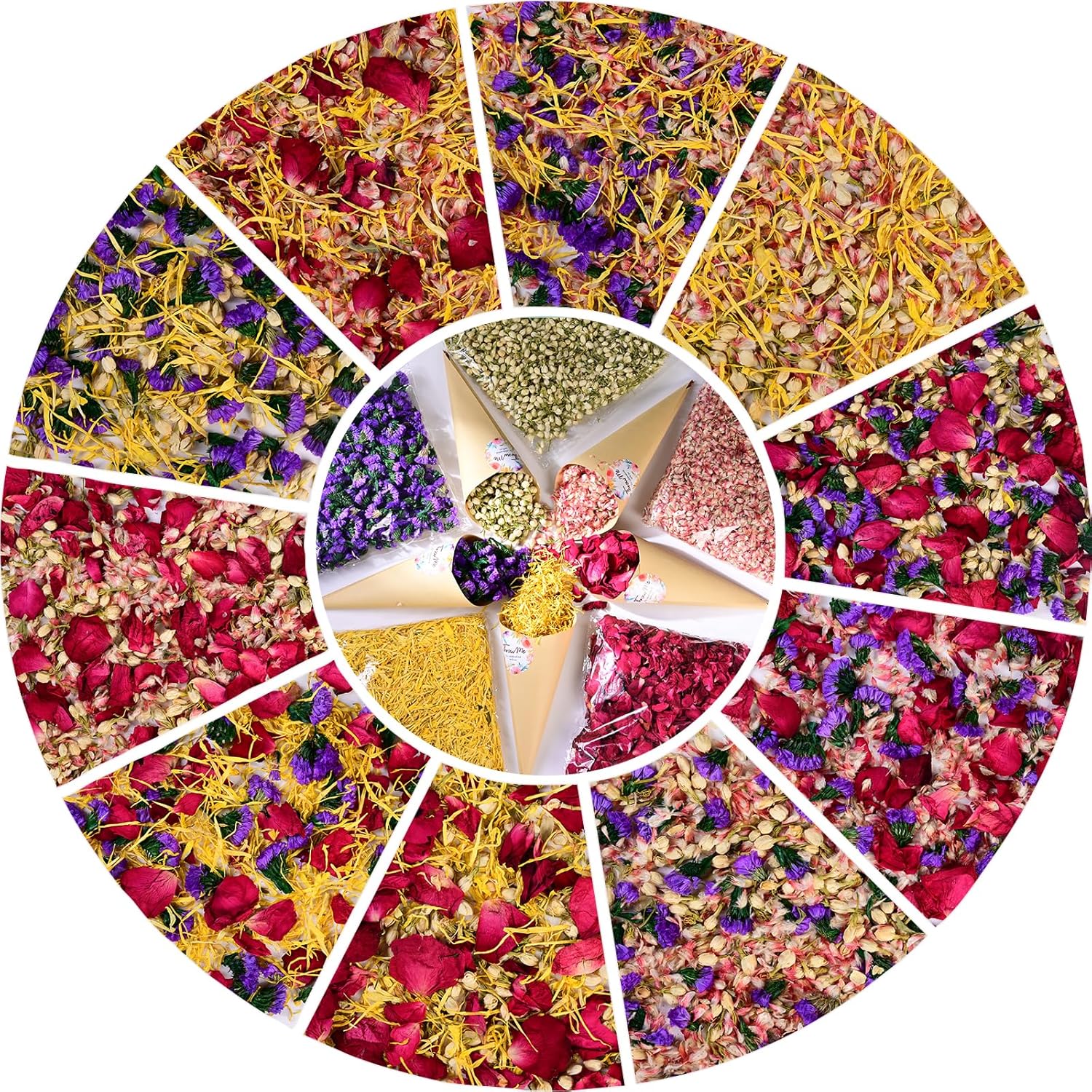 - Premium Wedding Confetti - Real Dried Flower Petals Mix-Florist-designed blend of 5 natural petals: romantic red rose petals, elegant white jasmine, golden chrysanthemums, vibrant purple forget-me-nots, and soft pink plum blossoms. Perfect for boho wedding decor, flower girl toss, and Instagram-worthy photo backdrops.