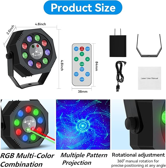 - High-Quality LED Stage Lights: This dj light for parties creates mesmerizing colors and patterns. With 9 LED colorful strobe, it covers approximately 700 square feet (approximately 67 square meters) with 360-degree lighting coverage, adding a dazzling and magical touch to your party decor