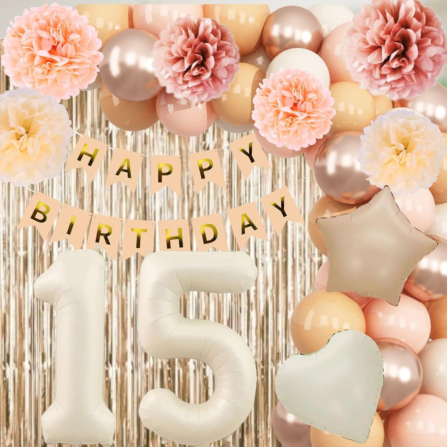 - PACKAGE INCLUDES: 1pc beige 15 number balloon, 1pc happy birthday banner, 2pcs dusty pink paper pom poms, 2pcs blush paper pom poms, 2pcs nude paper pom poms, 1pc champagne gold fringe curtain, 1pc caramel star foil balloons, 1pc cream heart foil balloons, 8pcs nude balloons, 6pcs blush balloons, 8pcs beige balloons, 4pcs champagne gold balloons, 1pc ribbon