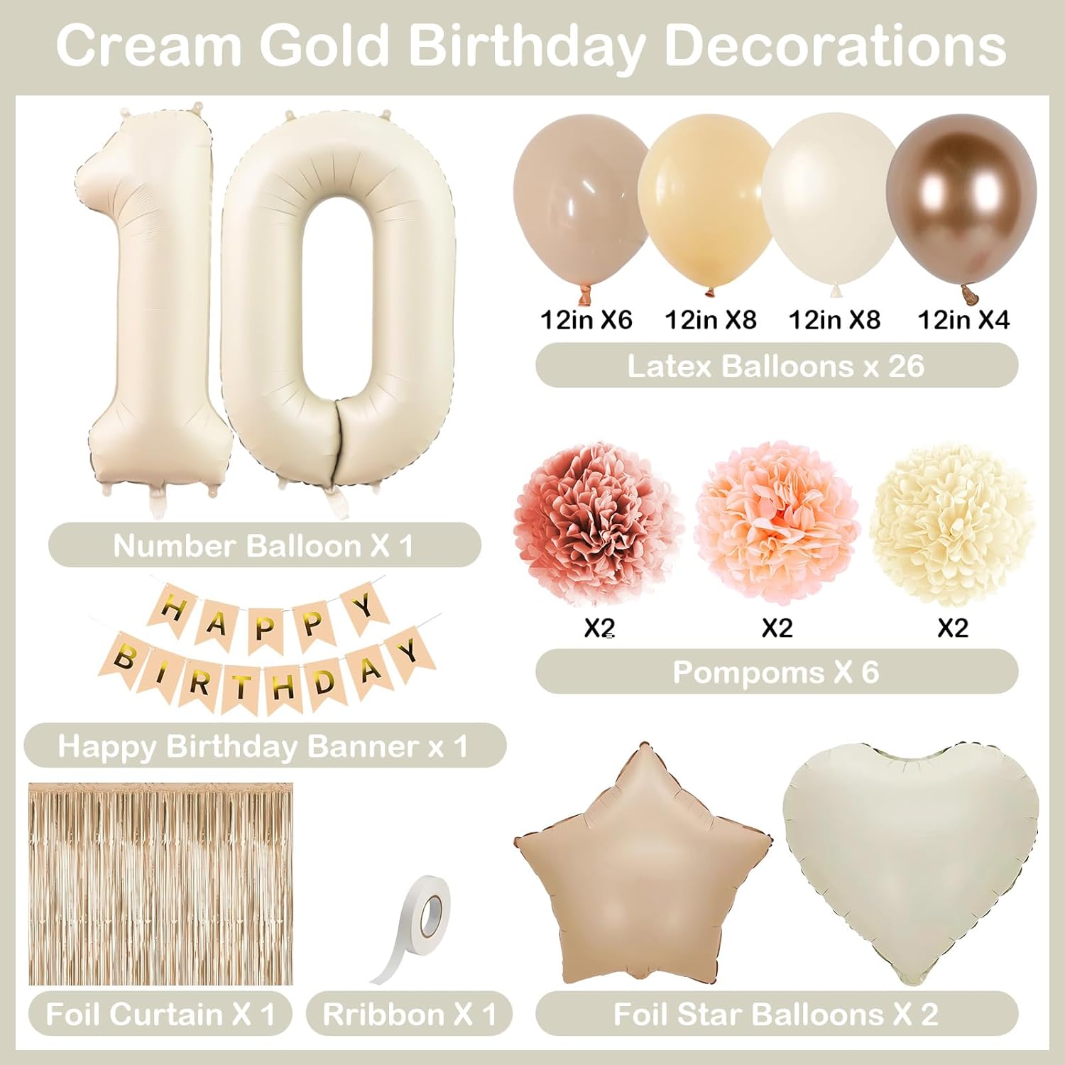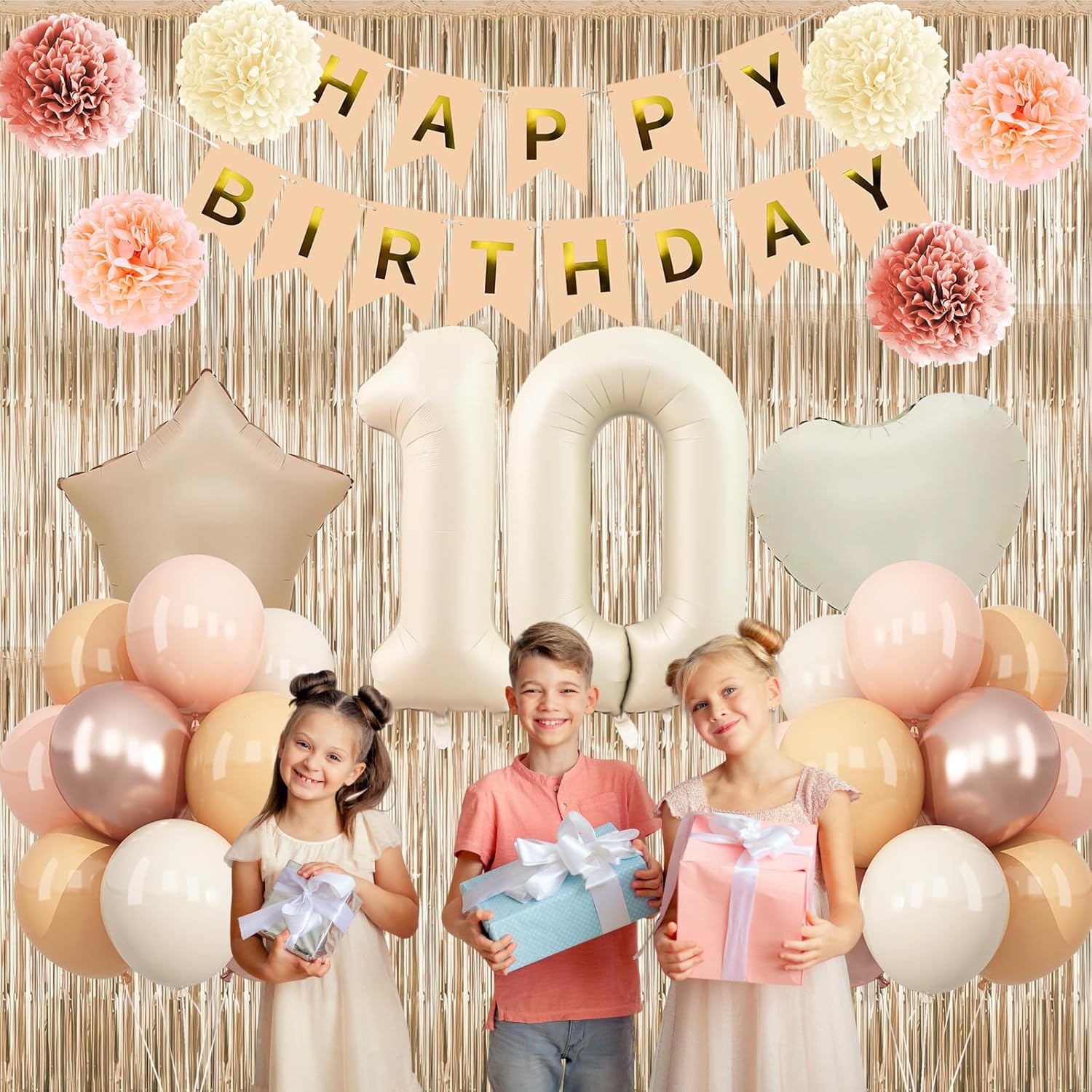 - PACKAGE INCLUDES: 1pc beige 10 number balloon, 1pc happy birthday banner, 2pcs dusty pink paper pom poms, 2pcs blush paper pom poms, 2pcs nude paper pom poms, 1pc champagne gold fringe curtain, 1pc caramel star foil balloons, 1pc cream heart foil balloons, 8pcs nude balloons, 6pcs blush balloons, 8pcs beige balloons, 4pcs champagne gold balloons, 1pc ribbon