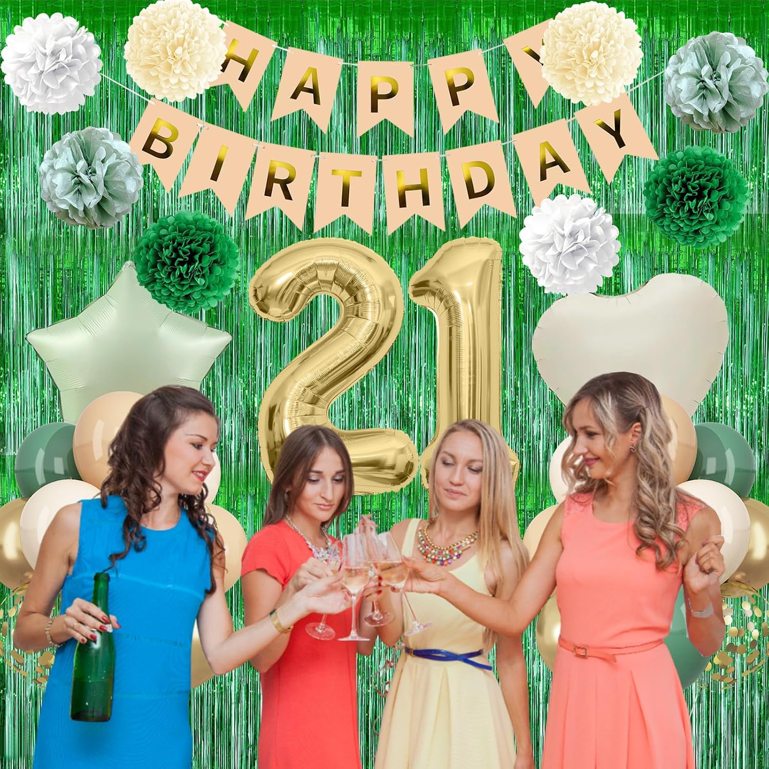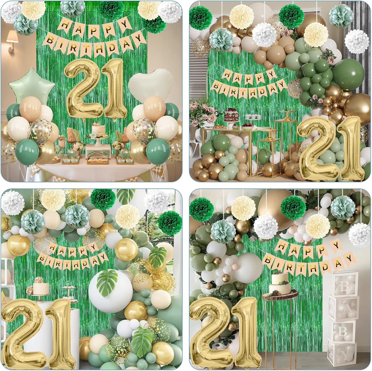 - PACKAGE INCLUDES: 1pc gold 21 number balloon, 1pc happy birthday banner, 2pcs deep green paper pom poms, 2pcs sage green paper pom poms, 2pcs nude paper pom poms, 2pcs white paper pom poms, 1pc green fringe curtain, 1pc olive green star foil balloons, 1pc cream heart foil balloons, 6pcs nude balloons, 6pcs sage green balloons, 6pcs beige balloons, 4pcs metallic gold balloons, 4pcs gold confetti balloons, 1pc ribbon