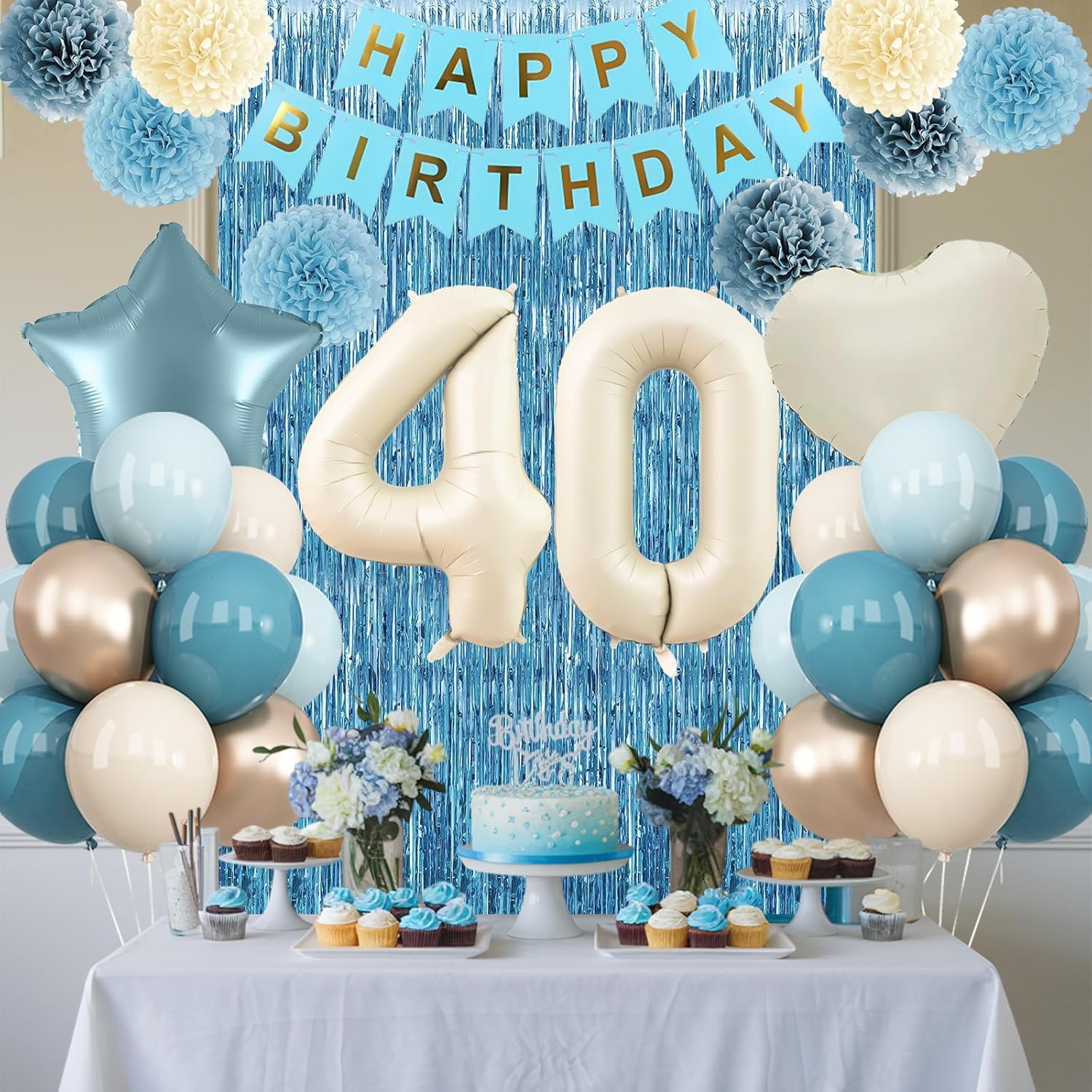 - ALL-IN-ONE DECORATION: Comes with a “40” foil number balloon, includes everything you need: birthday banner, fringe curtain, blue beige gold balloons, star foil balloons, paper pom poms, and ribbon, ideal for 40 year old birthdays, 40th birthday party, photo shoots, and family gatherings, suits both indoor and outdoor setups