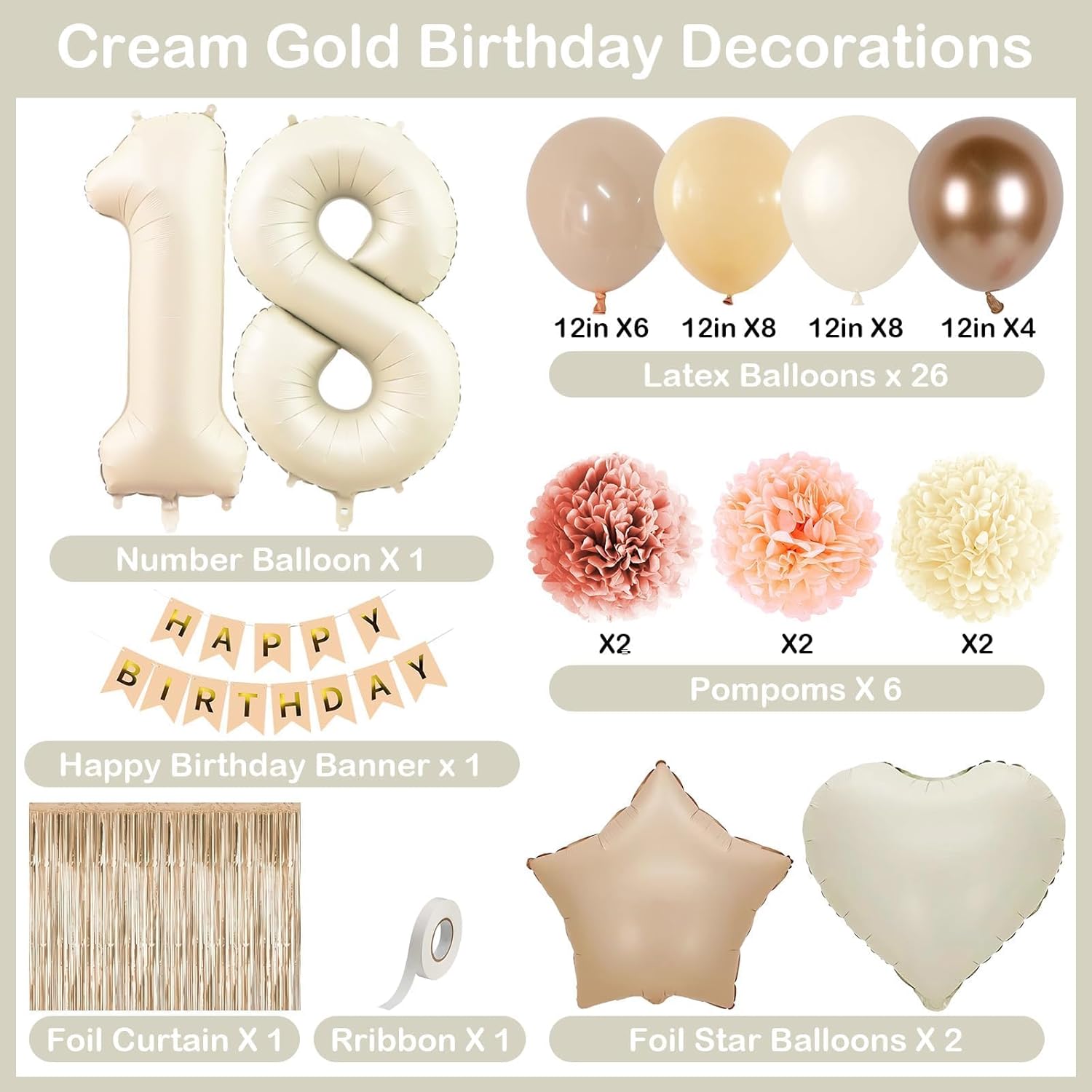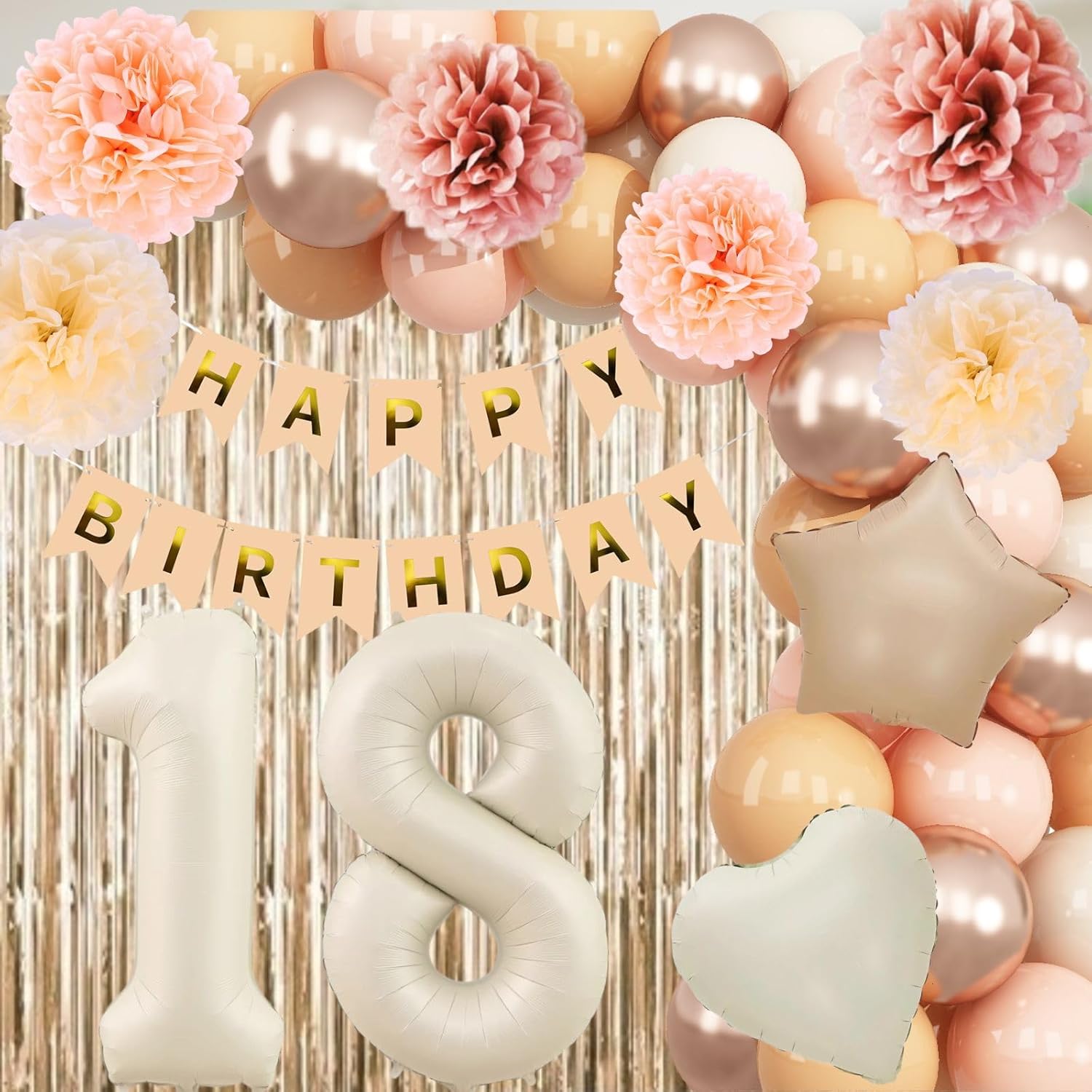 - PACKAGE INCLUDES: 1pc beige 18 number balloon, 1pc happy birthday banner, 2pcs dusty pink paper pom poms, 2pcs blush paper pom poms, 2pcs nude paper pom poms, 1pc champagne gold fringe curtain, 1pc caramel star foil balloons, 1pc cream heart foil balloons, 8pcs nude balloons, 6pcs blush balloons, 8pcs beige balloons, 4pcs champagne gold balloons, 1pc ribbon