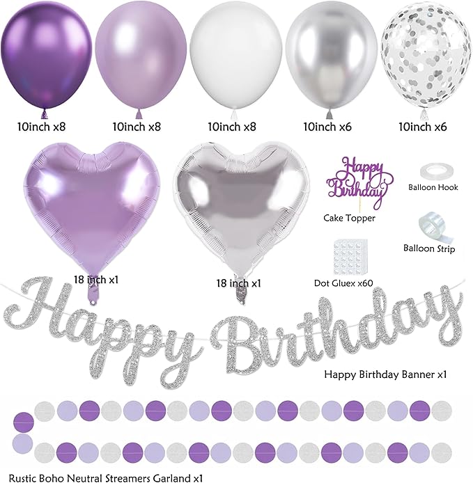 - All-in-One Party Decoration Kit: This complete kit includes everything you need to create an unforgettable celebration! It features a birthday banner, circle dot paper banner, 5 tissue pom poms, 3 paper lanterns, 3 paper flower fans, 42 purple and silver balloons, 6 hanging swirl streamers, and a birthday cake topper.