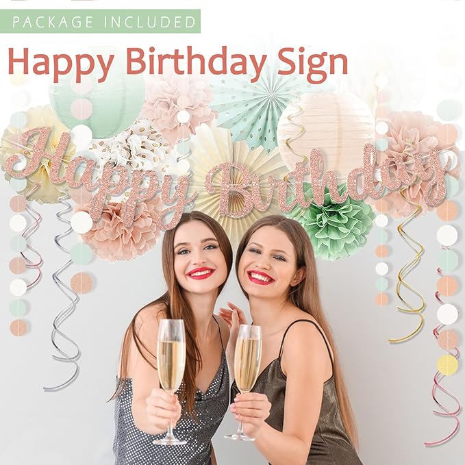 - Easy to Assemble: The paper fan and paper lanterns are easy assemble, the birthday banners can be diy, the circle dots paper banner has been assembled but tissue paper pompoms take more time to put together, please diy with the instructions. Pink and Green Gold Balloon Set is matched with a balloon chain, which can make a balloon arch, string the balloons together and hang them on the door, wall, fence