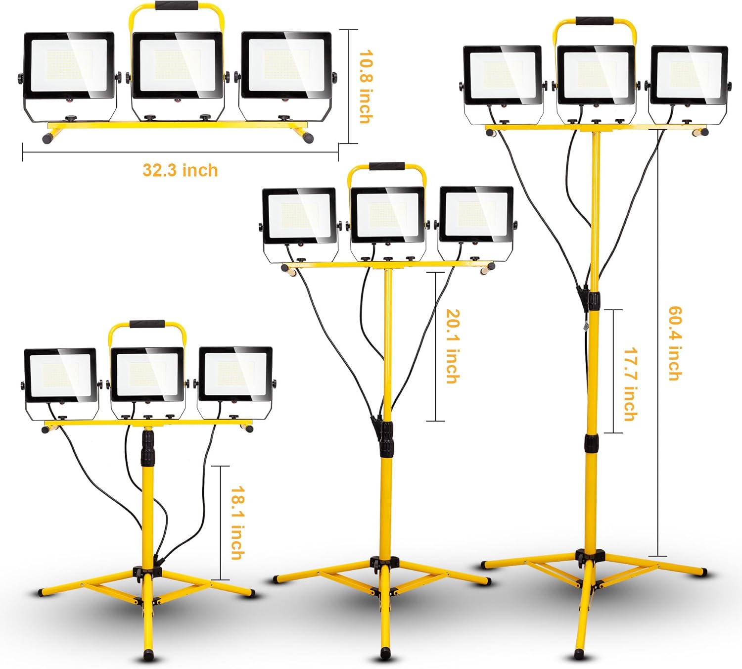 30000 Lumen Work Lights with Stand, 300W Three Head LED Work Light, Waterproof Lamp with Individual Switch, Adjustable Metal Telescoping Tripod