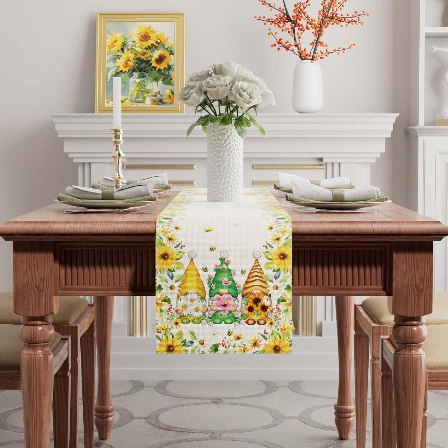 XCHI Yellow White Daisies Flowers Gnomes Spring Table Runner Burlap Table Decoration for Summer Seasonal Home Kitchen Dining Dinner Indoor Holiday Farmhouse Decor 13x108 Inch