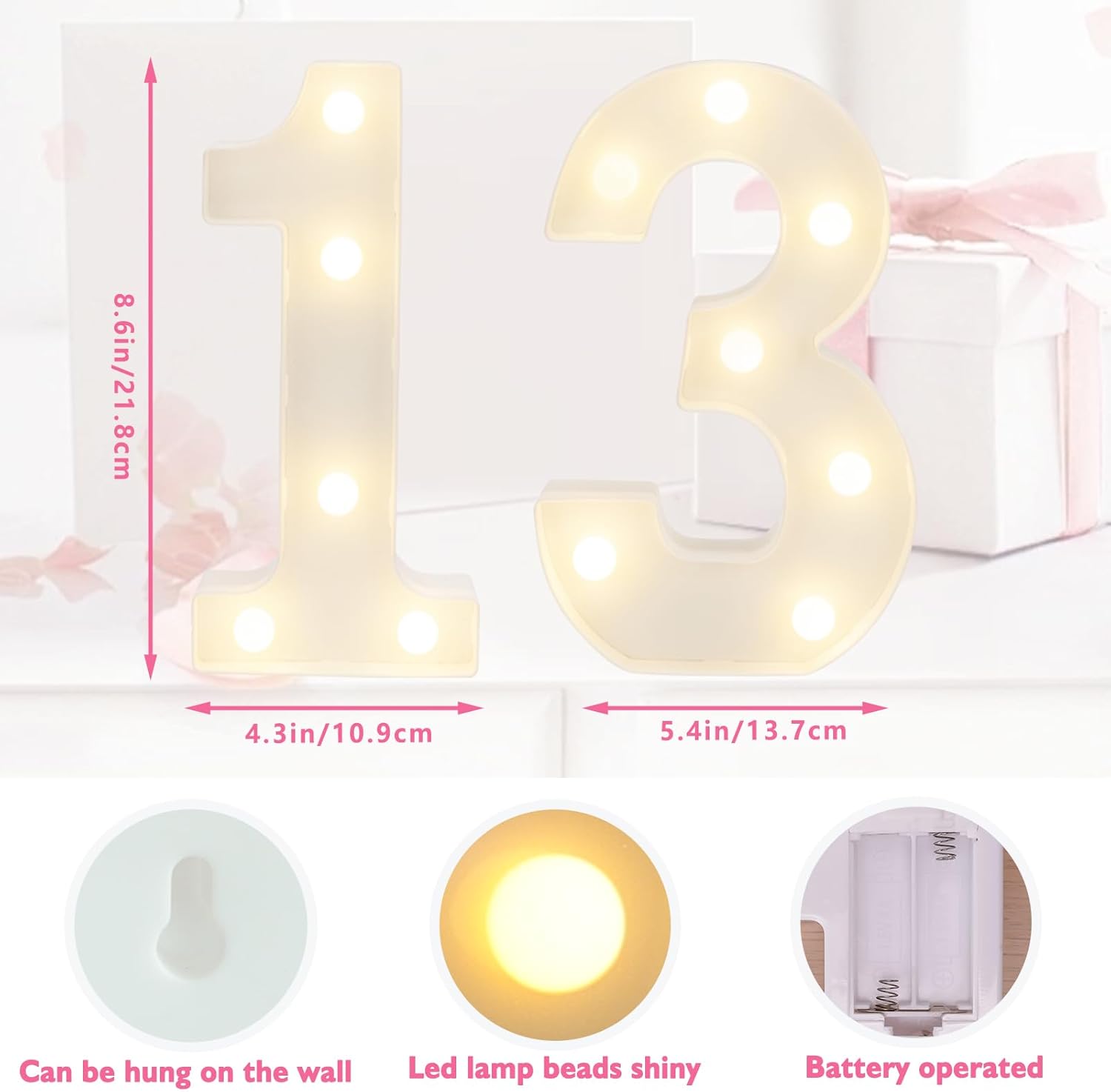 - 【Light Up Your Birthday】 Light up number lights are great birthday party supplies and decorations, perfect for all kinds of scenes and memorable moments. Light up your birthday party by spelling out “13” with our number lights, light up the wonderful moments, warm white lights create a cozy atmosphere, make your 13th birthday party more memorable and sparkling!