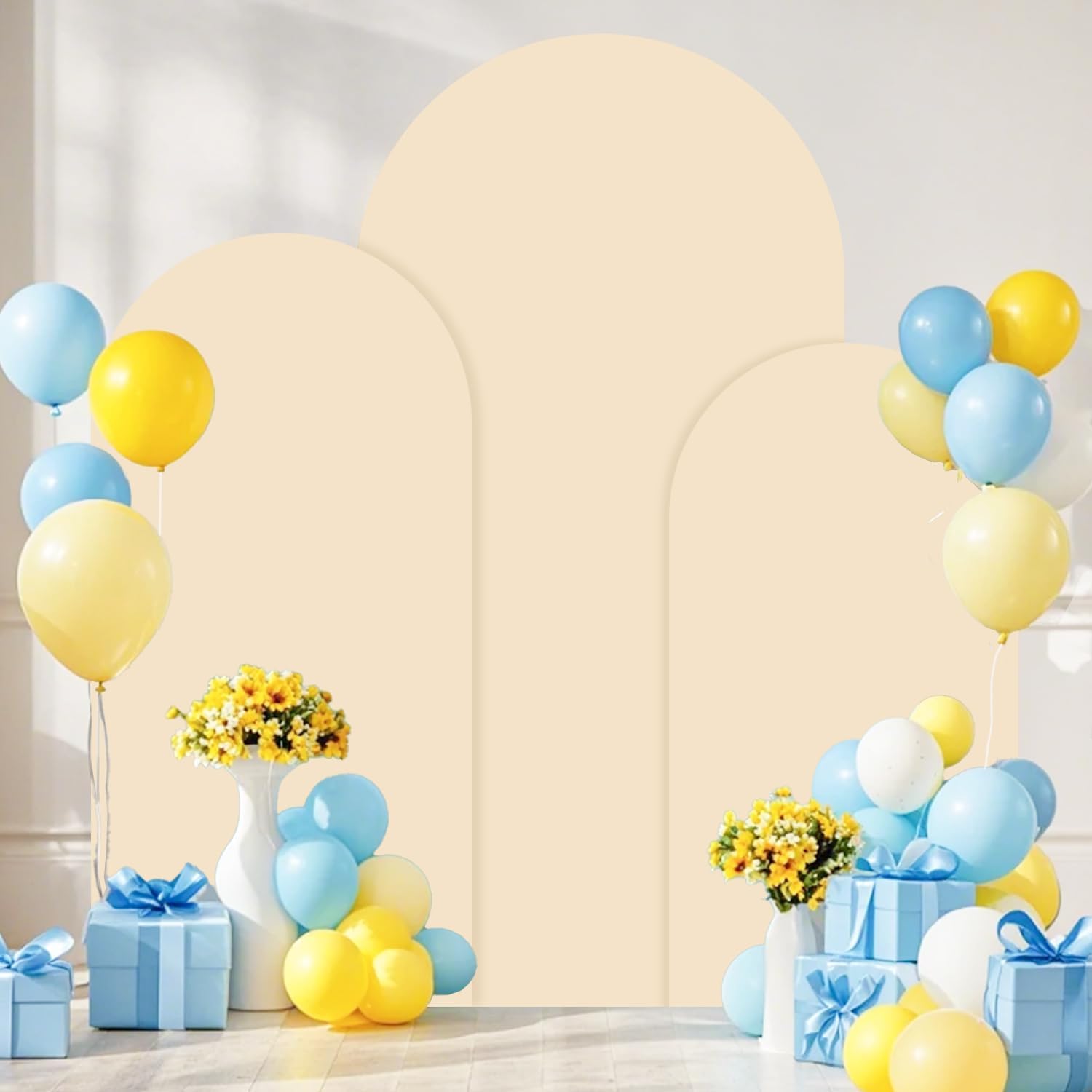- đ§¸ăSize Information- Wedding Arch Stand and Cover SetăArch stand and cover set includes 3 gold metal arch backdrop stands and 3 beige arch cover in sizes 7.2FT x 4FT(H x W), 6.6FT x 3.3FT(H x W) and 6FT x 2.6FT(H x W). The backdrop arch stand with cover is certain to meet your decoration needs and add a charming look to your celebrations.