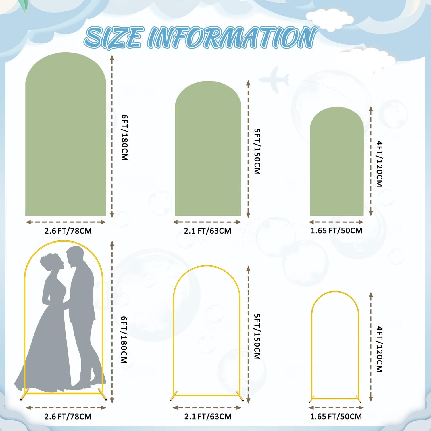 - đ§¸ăSize Information- Arch Backdrop Stand and Cover SetăArch stand and cover set includes 3 gold metal arch backdrop stands and 3 sage green arch cover in sizes 6FT x 2.6FT(H x W), 5FT x 2.1FT(H x W) and 4FT x 1.65FT(H x W). The backdrop arch stand with cover is certain to meet your decoration needs and add a charming look to your celebrations.