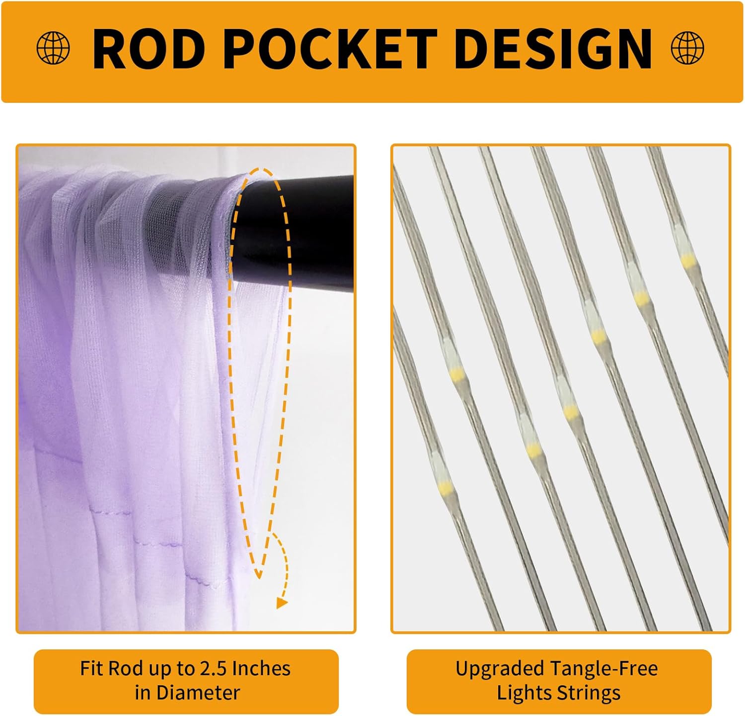 - Elegant Combination of Tulle Backdrop Curtains and Lights - Package Includes: 2 panels lavender sheer tulle backdrop curtains (5ft x10ft each, total 10x10ft).1 set of a 10x10ft warm white USB-powered tangle-free string lights (10 strands with 300 LEDs). 12 Transparent clips for hassle-free Installation. (Pro Tip: Buy multiple sets for fuller coverage and reduced sheerness!)