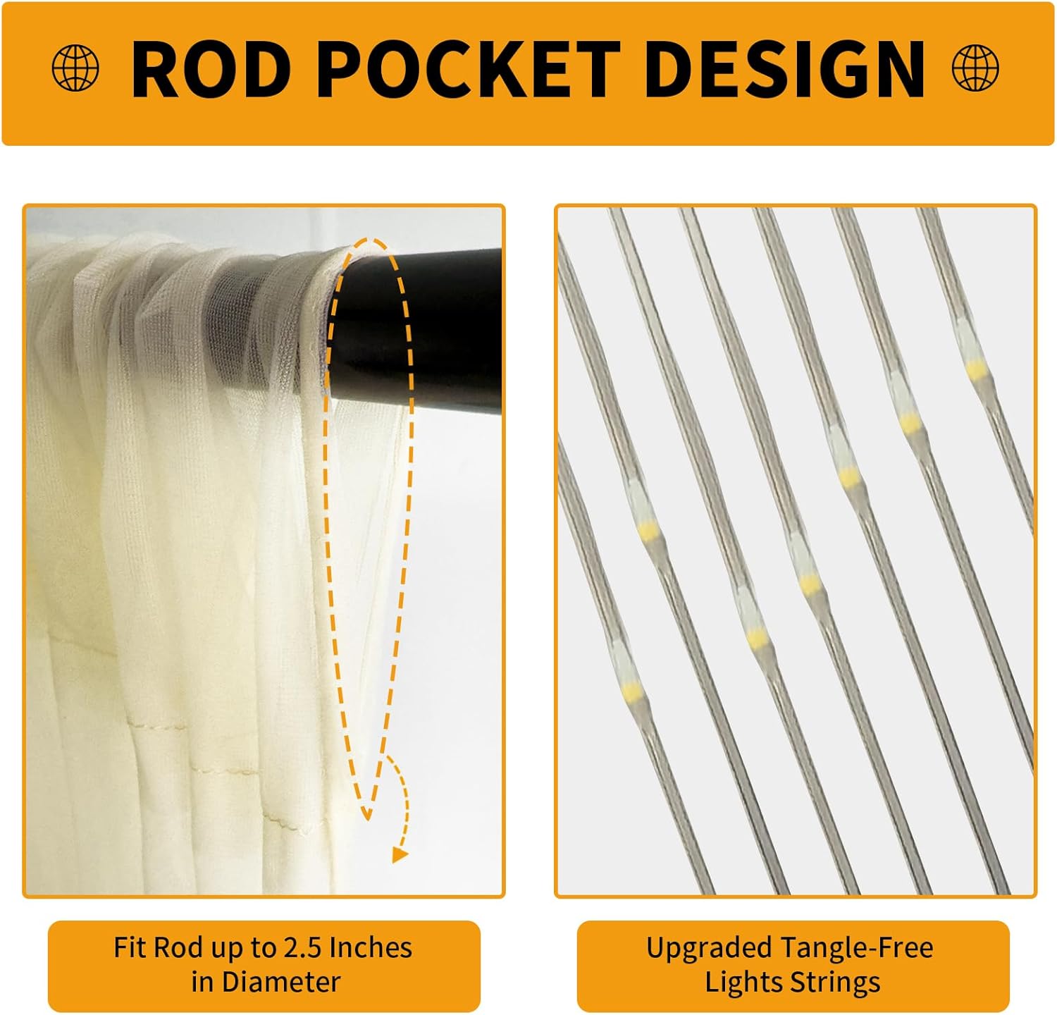 - Elegant Combination of Tulle Backdrop Curtains and Lights - Package Includes: 2 panels ivory sheer tulle backdrop curtains (5ft x10ft each, total 10x10ft).1 set of a 10x10ft warm white USB-powered tangle-free string lights (10 strands with 300 LEDs). 12 Transparent clips for hassle-free Installation. (Pro Tip: Buy multiple sets for fuller coverage and reduced sheerness!)