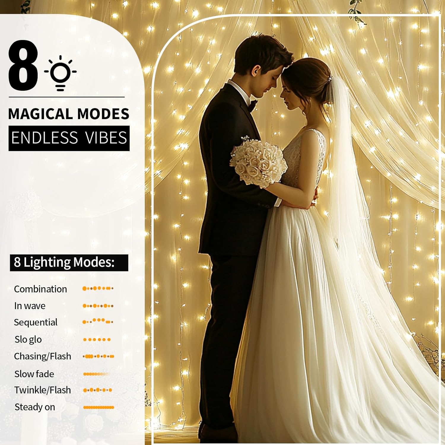 - Quick Setup in 3 Steps: 1. Hang curtains via rod pocket on any pipe/stand. 2. Attach lights using included clips before untying strands. 3. Plug USB into power bank/wall outlet β instant warm glow and choose from 8 lighting modes to create a romantic and magical atmosphere for any occasion! Tangle-free design saves 70% setup time