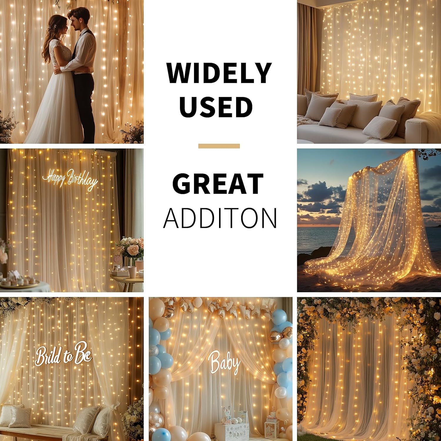 - All-Event Versatility: Perfect for creating magical backdrops at: Weddings (ceremonies, receptions, arches, bridal showers), Milestone Events (baby showers, birthdays, graduations), Photo Sessions (booths, portrait lighting), Seasonal Decor (Christmas windows, Halloween parties), Commercial Displays (stores, dessert tables, trade shows)