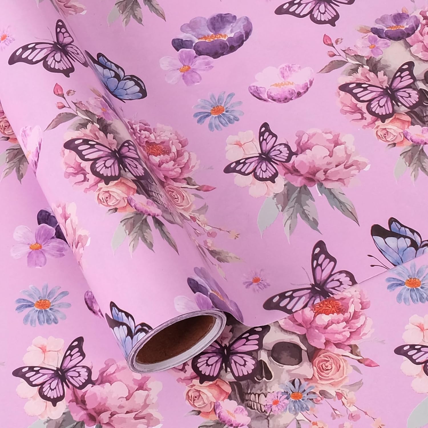 Aimyoo Gothic Wrapping Paper Roll, 17 Inch X 16.5 Feet Skull Floral Butterfly Design Gift Wrap Paper for Mother's Day, Birthday Bridal Shower