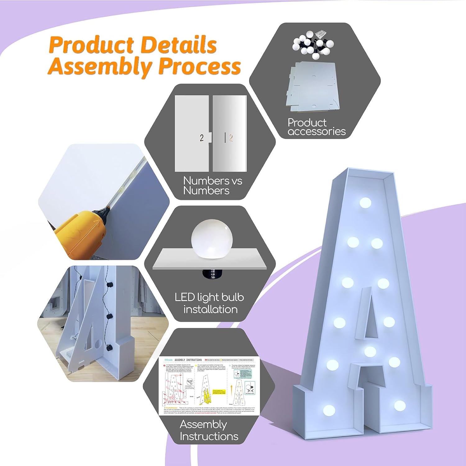 - DIY marquee letters/numbers assembly. Pre-cut panels with numbered slots for easy setup. Use a household hot glue gun (not included) and avoid high-power glue guns to prevent damage. Stabilize by placing a water bottle on the rear stand
