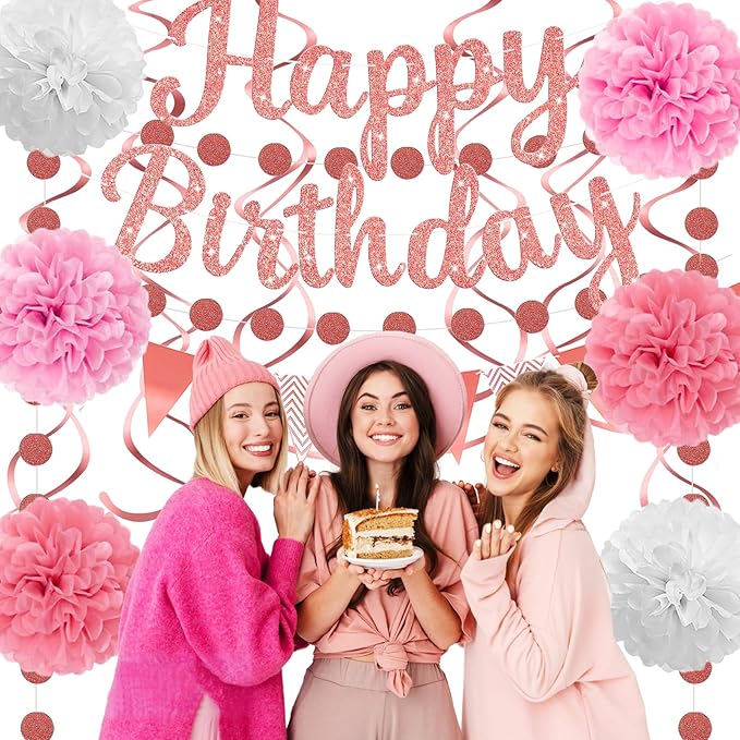 - Pink Rose Gold Birthday Decorations: Turn your dreams into reality with a celebration bathed in soft pink and pure white. This gentle, heartwarming palette creates a dreamy, elegant atmosphere, perfect for birthdays, milestones, or any special occasion. Designed for girls, teens, and women, it fills every moment with beauty, joy, and unforgettable memories.