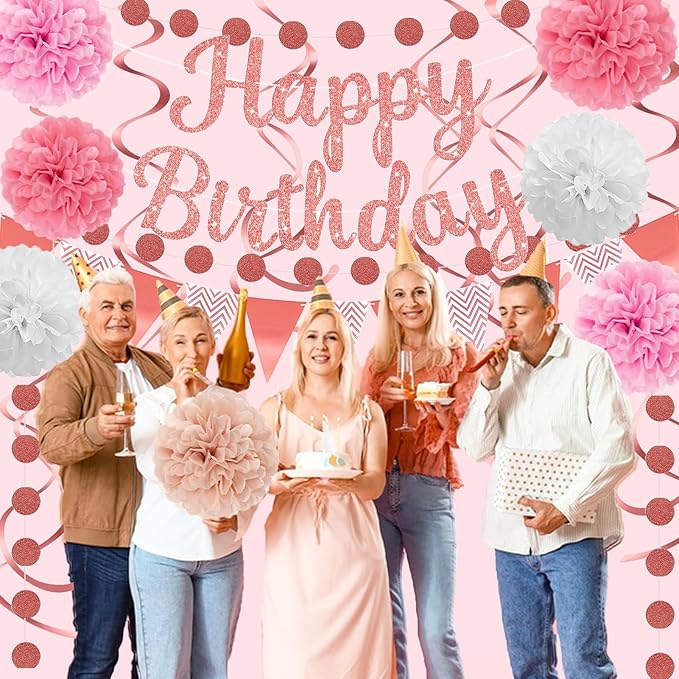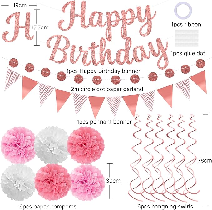 - Package includes:1pcs pink Happy Birthday banner, 1pcs circle dot paper garland, 6pcs 12inch paper pompoms, 6pcs hanging swirls, 1pcs pennant banner.