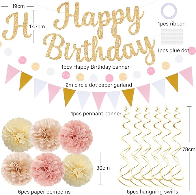 - Package includes:1pcs gold Happy Birthday banner, 1pcs circle dot paper garland, 6pcs 12inch paper pompoms, 6pcs hanging swirls, 1pc Pennant banner.