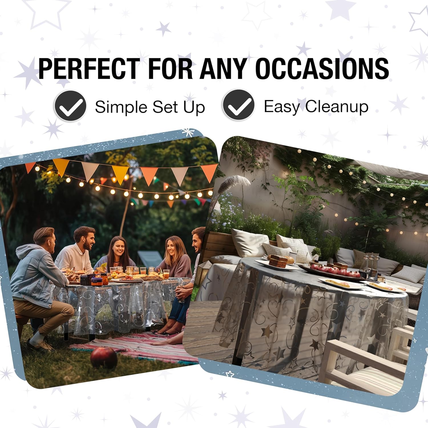- Quality: Made from premium Tablecloth Plastic, these round Tablecloths Plastic are waterproof, durable, and spill-resistant. Use these Plastic Table Covers for worry-free protection. These Silver Star table cloths for parties are great for indoor or outdoor events, ensuring your tables stay mess-free and stylish.