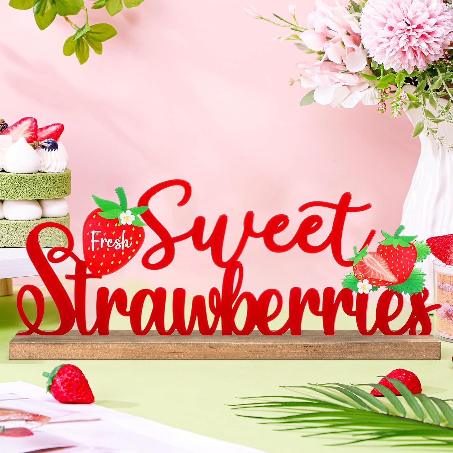 - Strawberries Themed Design: our strawberries tabletop word sign designed with vivid metal wording and a solid wooden base; The sign is also decorated with flowers, making it an eye catching decoration for your summer celebrations