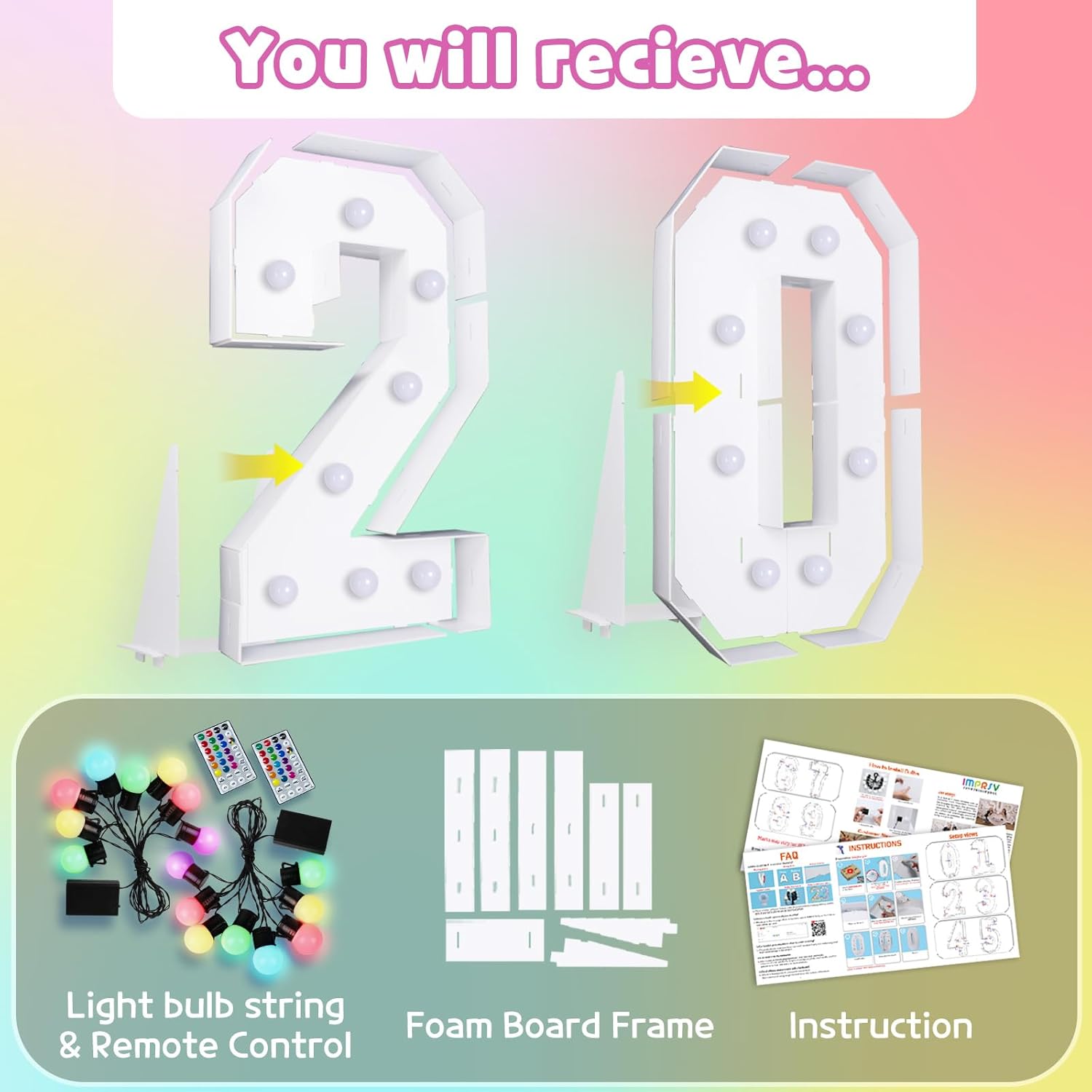 Marquee Numbers 20th-Birthday Decoration: Colorful 3FT Large Light Up 20 Year Old Birthday Decorations Anniversary Backdrop for Boys Girls Cardboard Sign 18 Colors Number 20 Mosaic Balloon Frame