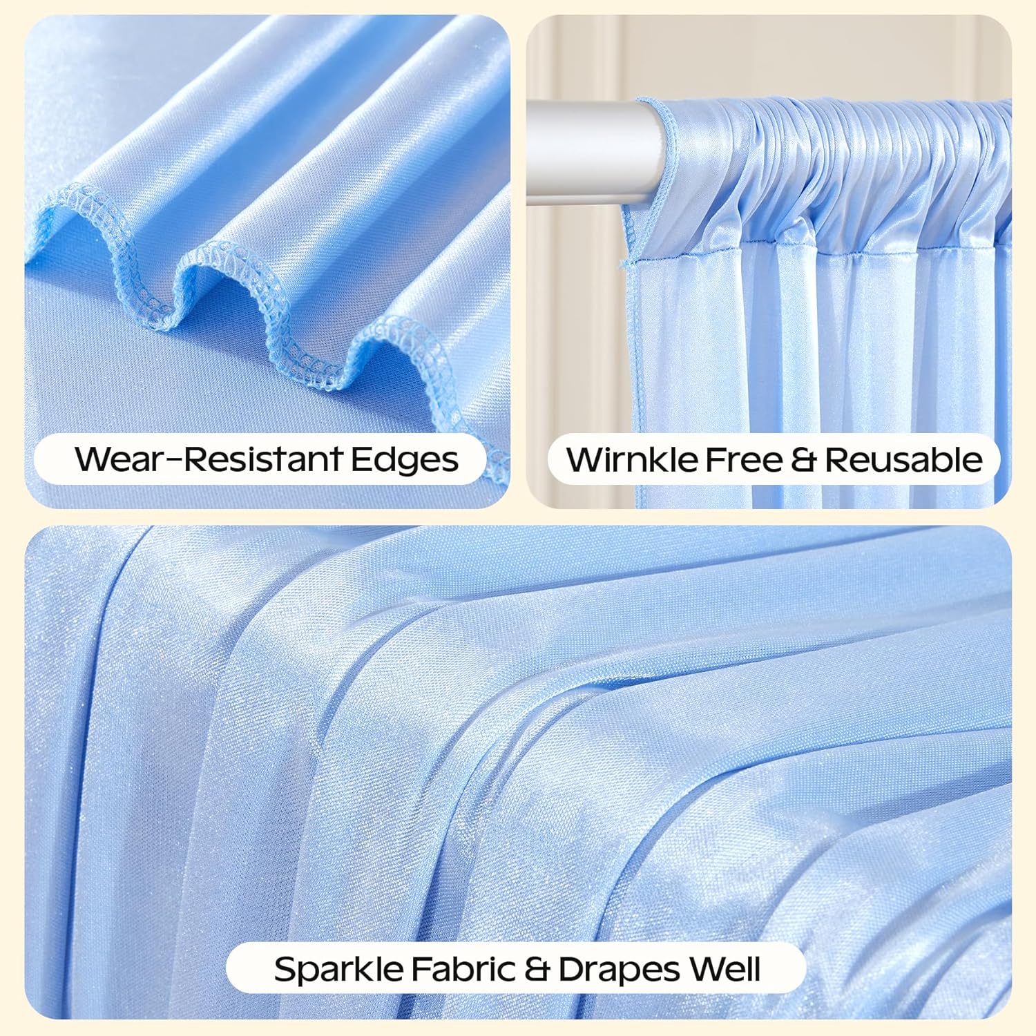 - Blue Shimmer Curtain Backdrop Package Included & Easy to install:The package included 2 Panels 5x10ft backdrop curtain,which can be arranged side by side to create a 10x10ft backdrop or used separately.Install way: Insert a rod or hang it on walls, ceilings, or temporary frames.