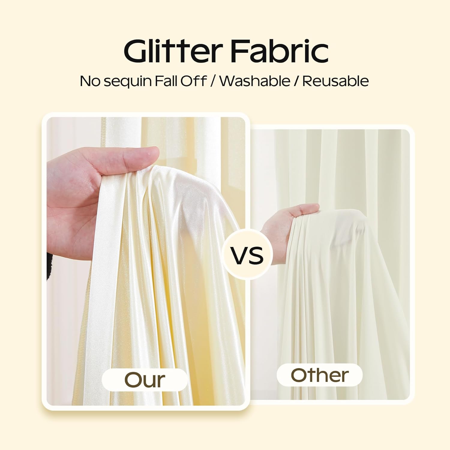 - Champagne Shimmer Backdrop Curtain Anti-wrinkle:This glitter backdrop curtain made of luminous fabric,it is thick and well-made,the fabric is very smooth and drapes fantastically.it could added some elegance to a event. The material can keeping the natural droop when falls on the floor to perfect for various theme events.