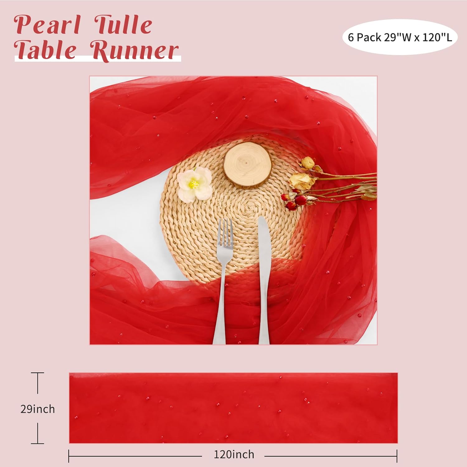 Set of 6 Pearl Table Runner 29 x 120 Inch Tulle Fabric Lace Table Runners Boho Rustic Tablecloth for Bridal Shower Birthday Party Wedding Arch Aisle Veil Dessert Table Decor(Red)