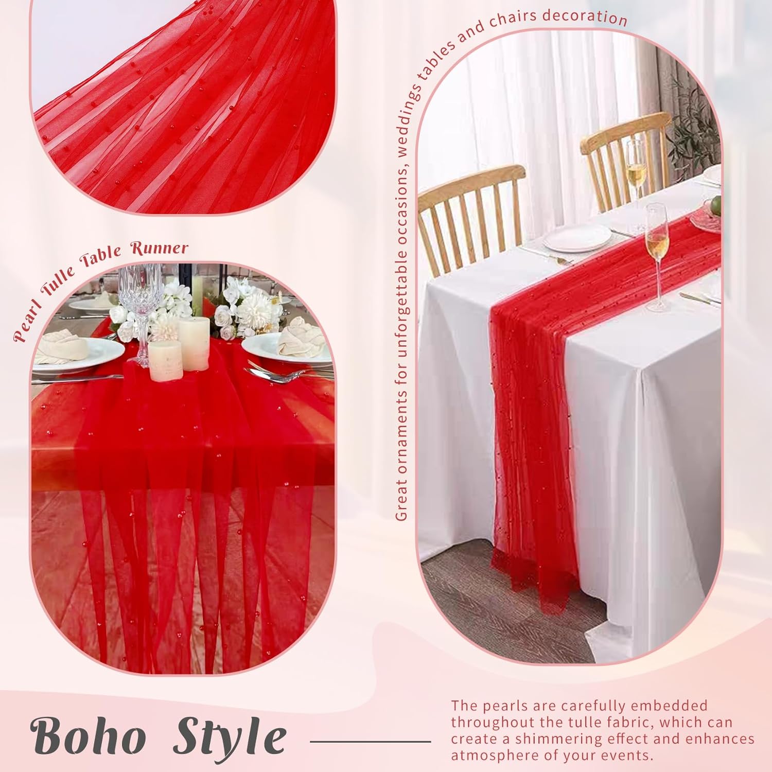 - 【Package Include】 You will receive 6 pieces of 29 x 120 inches pearl tulle table runners, the quantity is sufficient for your daily use and replacement needs, it's long enough to fit different size tables and chairs, These tulle table runner with pearls are skin-friendly. There are lots of different colors for you to choose. Perfect to decorate your tables.